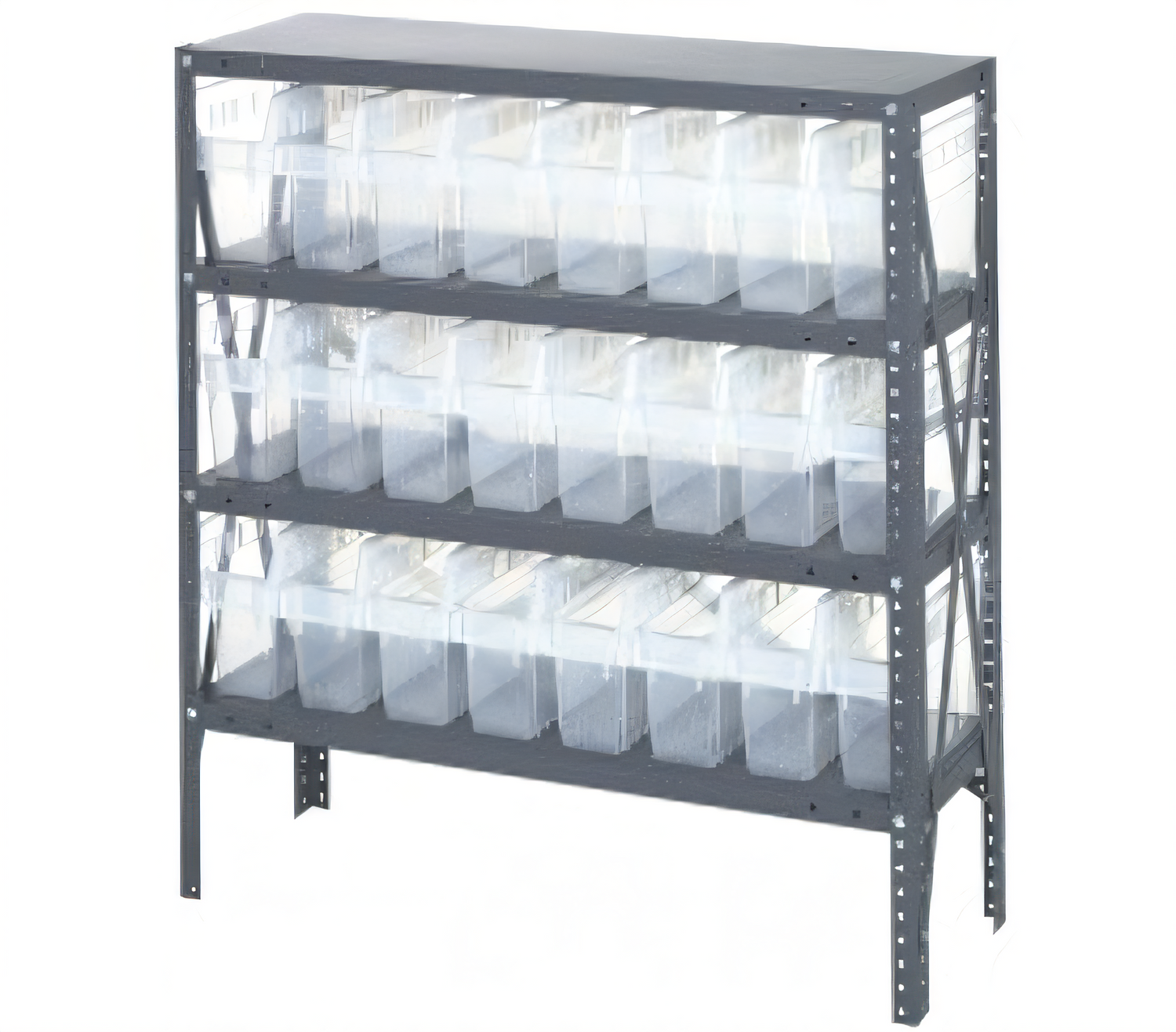 Shelving Unit, 12"D x 36"L x 39"H, heavy duty, 400 lb. load capacity per shelf, includes: (4) shelves, (24) 11-5/8"L x 4-3/8"W x 8"H (QSB801) clear bins, uprights and cross bars, smooth powder-coat finish