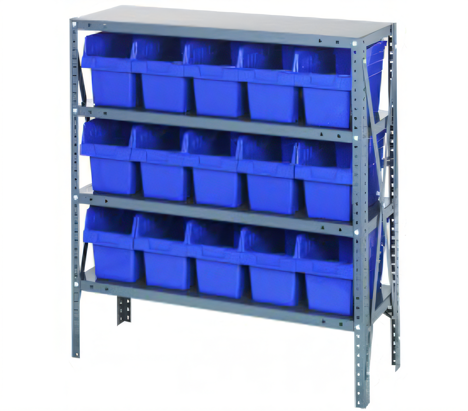Shelving Unit, 12"D x 36"L x 39"H, heavy duty, 400 lb. load capacity per shelf, includes: (4) shelves, (15) 11-5/8"L x 6-5/8"W x 8"H (QSB802) bins available in multiple colors, uprights and cross bars, smooth powder-coat finish
