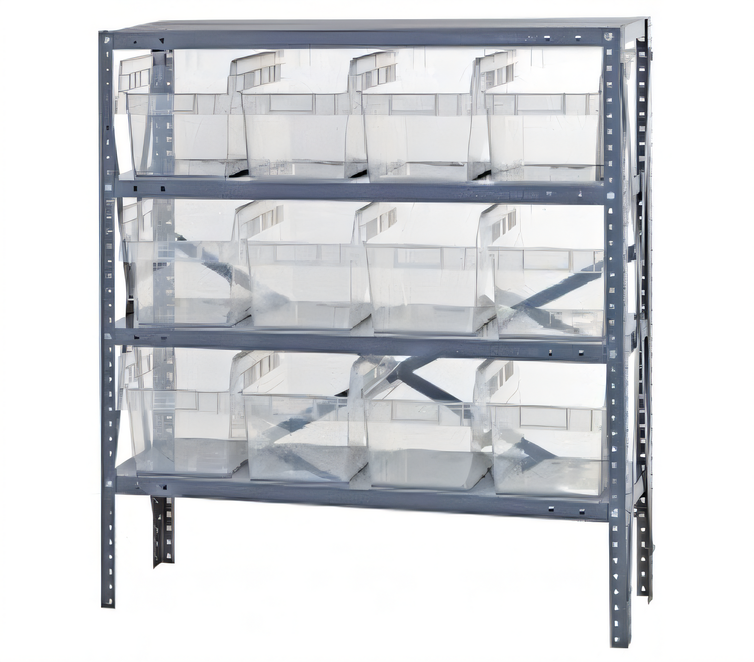 Shelving Unit, 12"D x 36"L x 39"H, heavy duty, 400 lb. load capacity per shelf, includes: (4) shelves, (12) 11-5/8"L x 8-3/8"W x 8"H (QSB807) clear bins, uprights and cross bars, smooth powder-coat finish