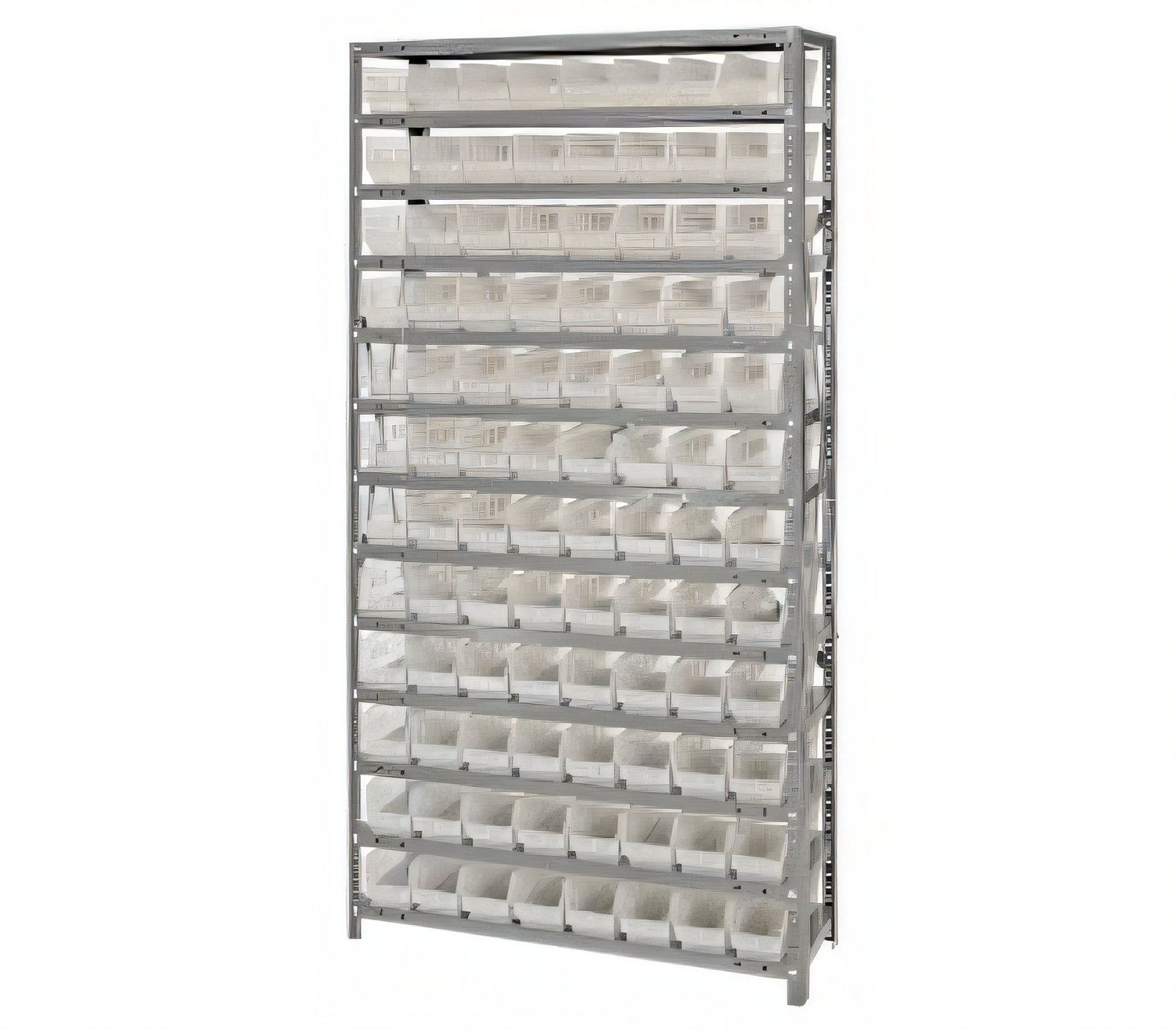Shelving Unit, 12"D x 36"L x 75"H, heavy duty, 400 lb. load capacity per shelf, includes: (13) shelves, (96) 11-5/8"L x 4-1/8"W x 4"H (QSB101) clear bins, uprights and cross bars, smooth powder-coat finish