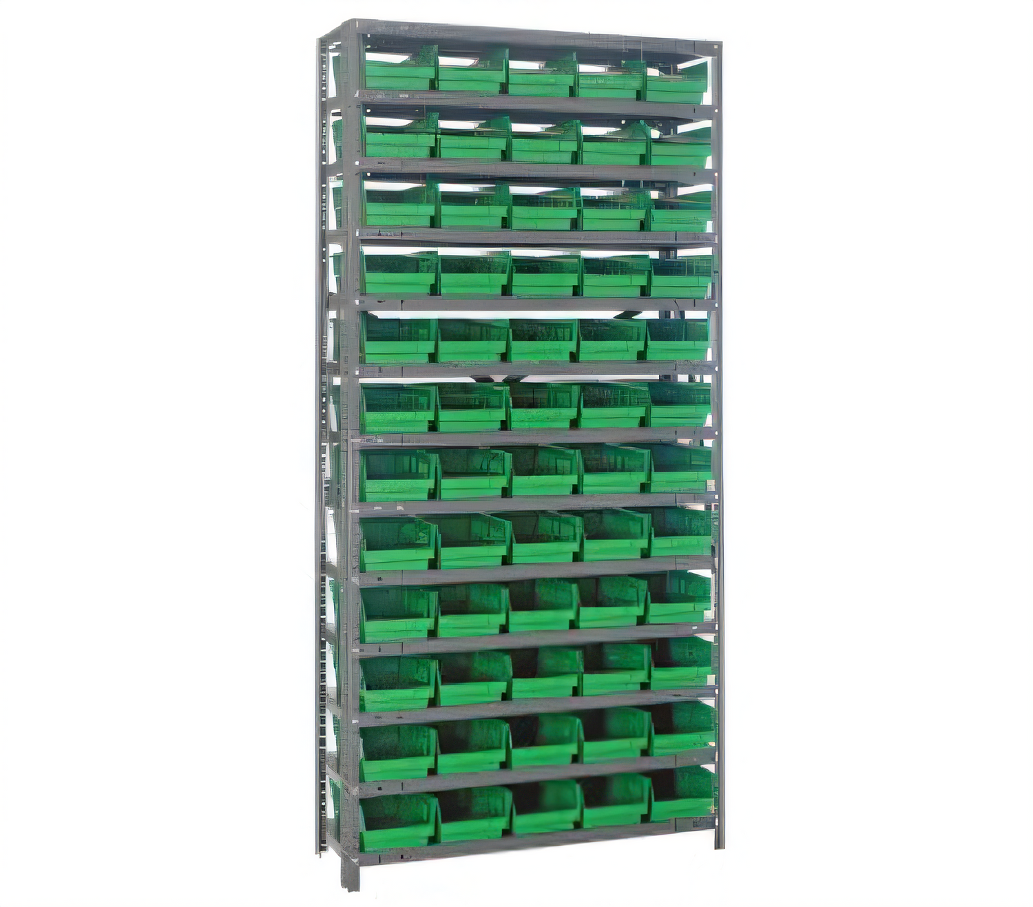 Shelving Unit, 12"D x 36"L x 75"H, heavy duty, 400 lb. load capacity per shelf, includes: (13) shelves, (60) 11-5/8"L x 6-5/8"W x 4"H (QSB102) bins available in multiple colors, uprights and cross bars, smooth powder-coat finish