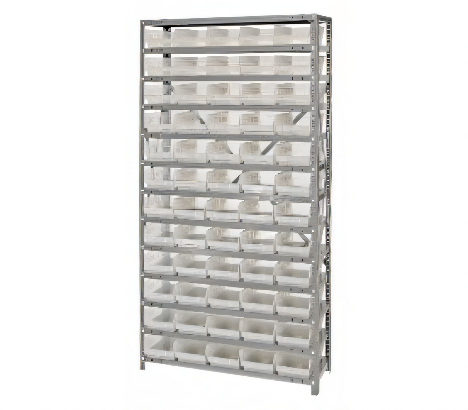 Shelving Unit, 12"D x 36"L x 75"H, heavy duty, 400 lb. load capacity per shelf, includes: (13) shelves, (60) 11-5/8"L x 6-5/8"W x 4"H (QSB102) clear bins, uprights and cross bars, smooth powder-coat finish
