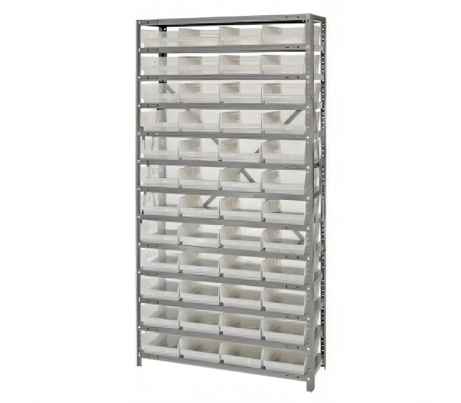 Shelving Unit, 12"D x 36"L x 75"H, heavy duty, 400 lb. load capacity per shelf, includes: (13) shelves, (48) 11-5/8"L x 8-3/8"W x 4"H (QSB107) clear bins, uprights and cross bars, smooth powder-coat finish