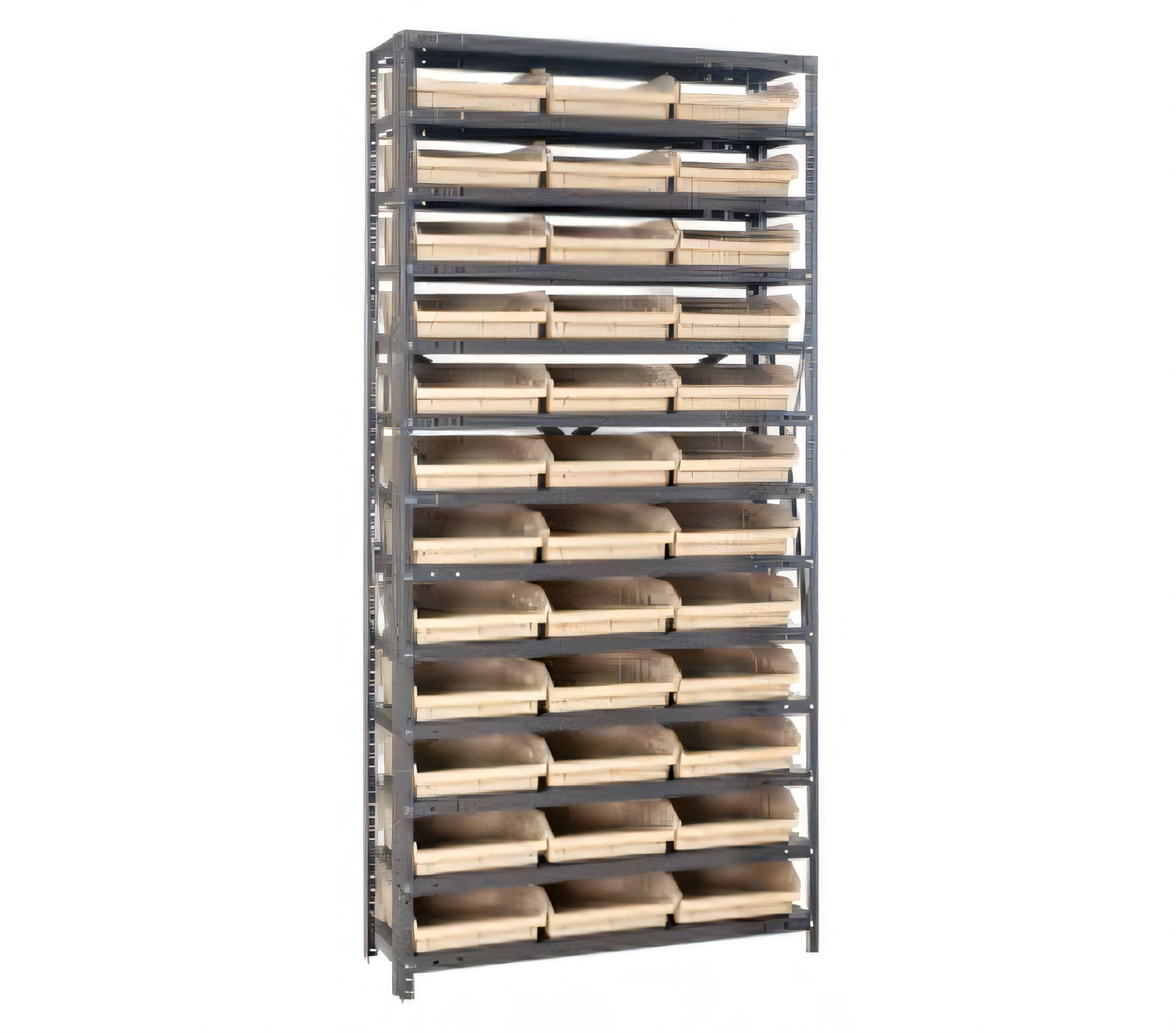Shelving Unit, 12"D x 36"L x 75"H, heavy duty, 400 lb. load capacity per shelf, includes: (13) shelves, (36) 11-5/8"L x 11-1/8"W x 4"H (QSB109) bins available in multiple colors, uprights and cross bars, smooth powder-coat finish