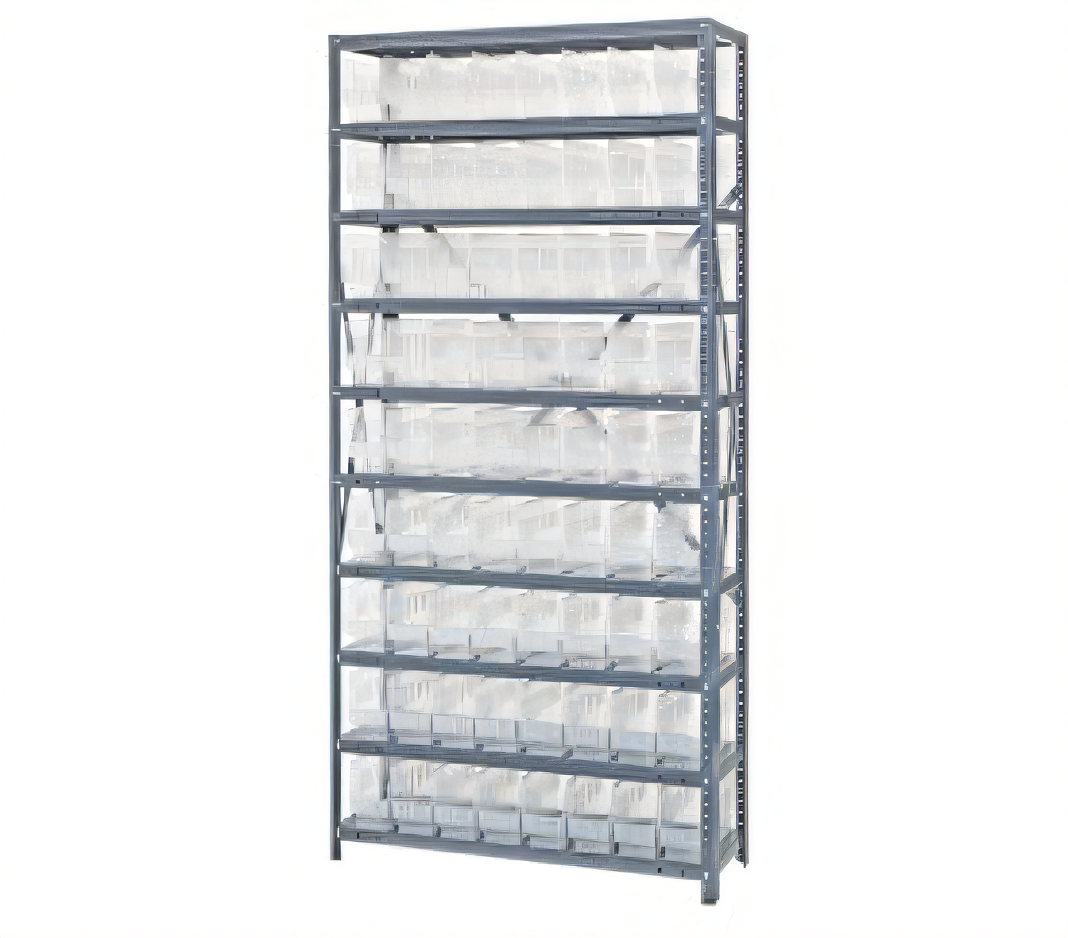Shelving Unit, 12"D x 36"L x 75"H, heavy duty, 400 lb. load capacity per shelf, includes: (10) shelves, (72) 11-5/8"L x 4-1/8"W x 6"H (QSB201) clear bins, uprights and cross bars, smooth powder-coat finish