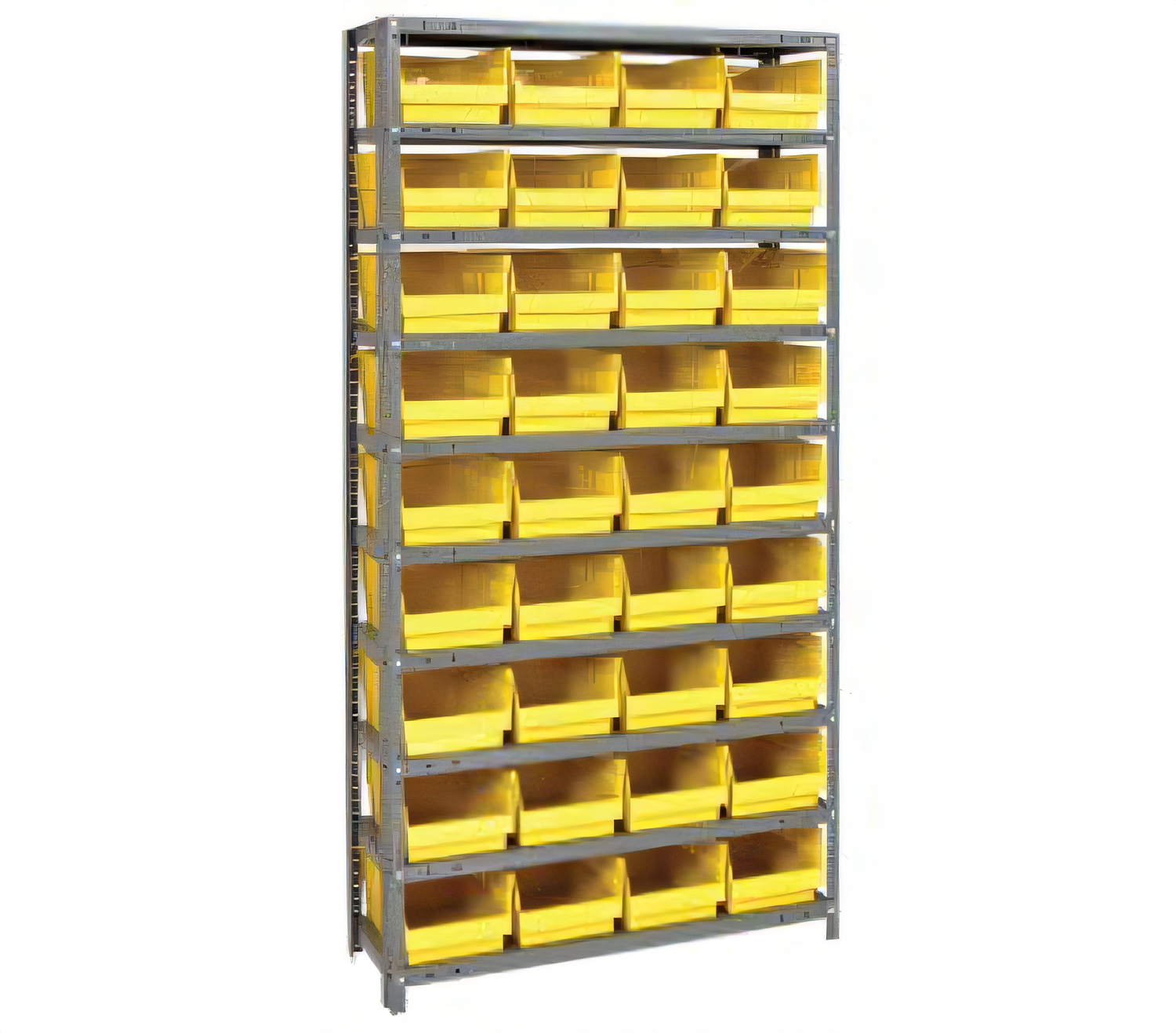 Shelving Unit, 12"D x 36"L x 75"H, heavy duty, 400 lb. load capacity per shelf, includes: (10) shelves, (36) 11-5/8"L x 8-3/8"W x 6"H (QSB207) bins available in multiple colors, uprights and cross bars, smooth powder-coat finish