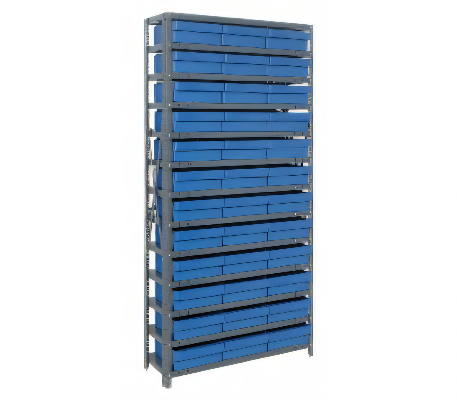 Shelving Unit, 12"D x 36"L x 75"H, heavy duty, 400 lb. load capacity per shelf, includes: (13) shelves, (36) 11-5/8"L x 11-1/8"W x 4-5/8"H (QED801) bins available in multiple colors, uprights and cross bars, smooth powder-coat finish