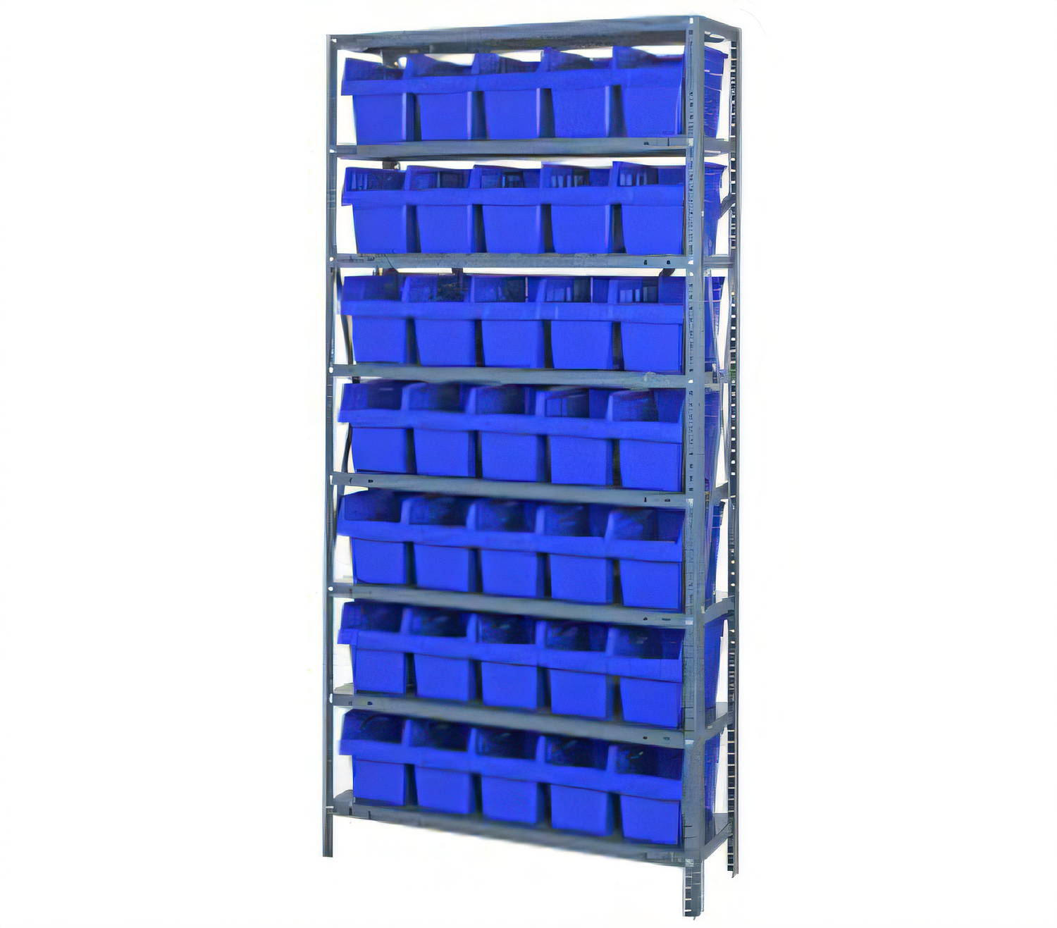 Shelving Unit, 12"D x 36"L x 75"H, heavy duty, 400 lb. load capacity per shelf, includes: (8) shelves, (35) 11-5/8"L x 6-5/8"W x 8"H (QSB802) bins available in multiple colors, uprights and cross bars, smooth powder-coat finish