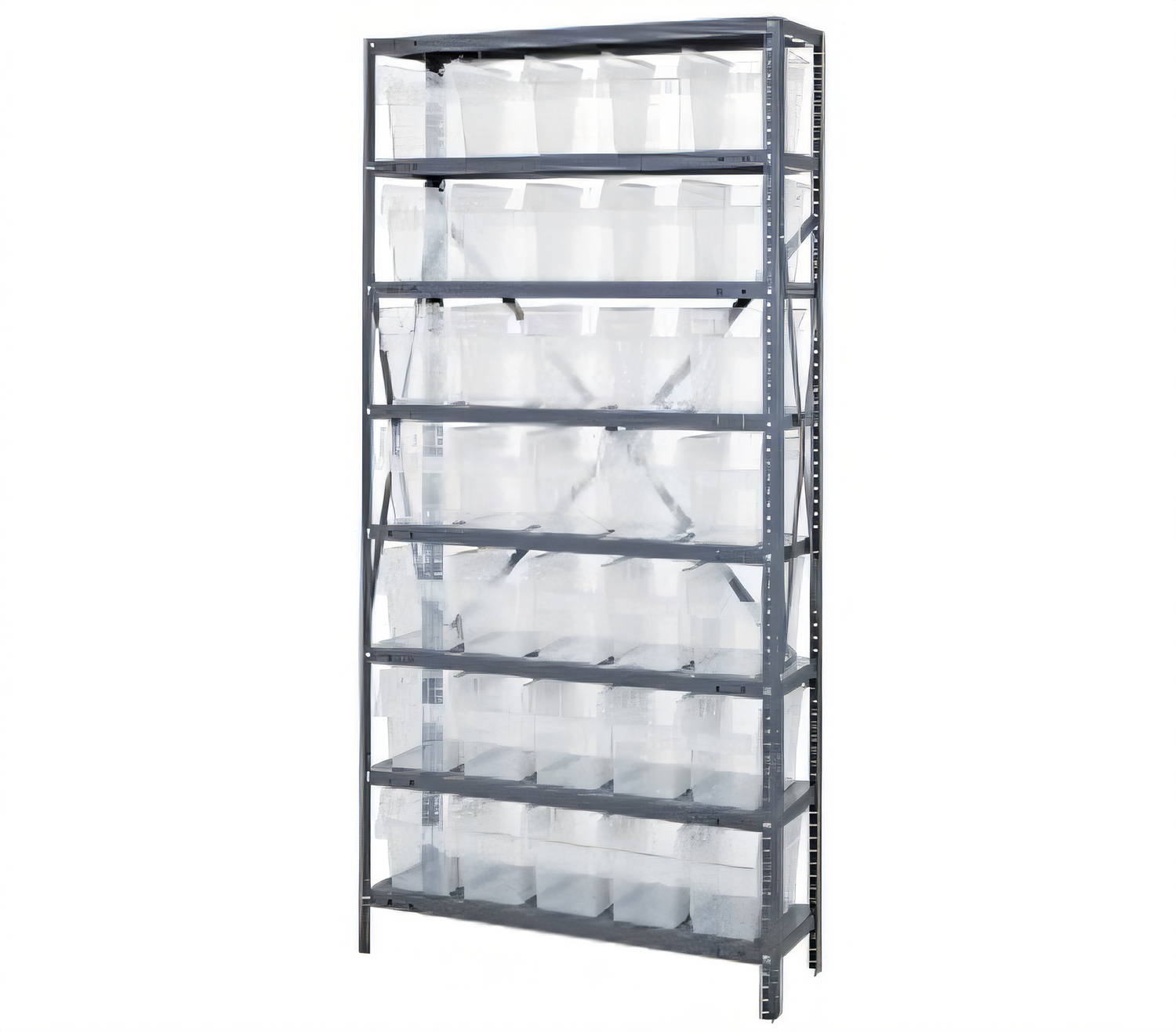 Shelving Unit, 12"D x 36"L x 75"H, heavy duty, 400 lb. load capacity per shelf, includes: (8) shelves, (35) 11-5/8"L x 6-5/8"W x 8"H (QSB802) clear bins, uprights and cross bars, smooth powder-coat finish