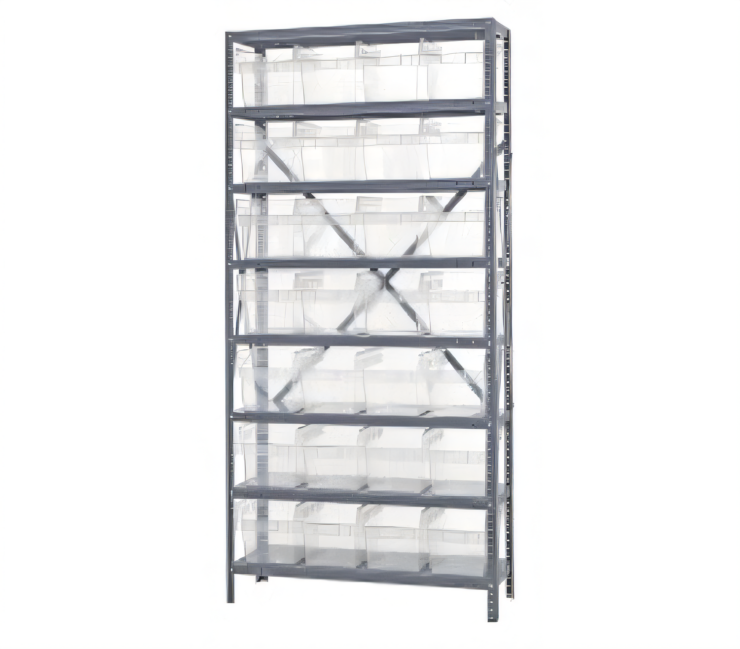 Shelving Unit, 12"D x 36"L x 75"H, heavy duty, 400 lb. load capacity per shelf, includes: (8) shelves, (28) 11-5/8"L x 8-3/8"W x 8"H (QSB807) clear bins, uprights and cross bars, smooth powder-coat finish
