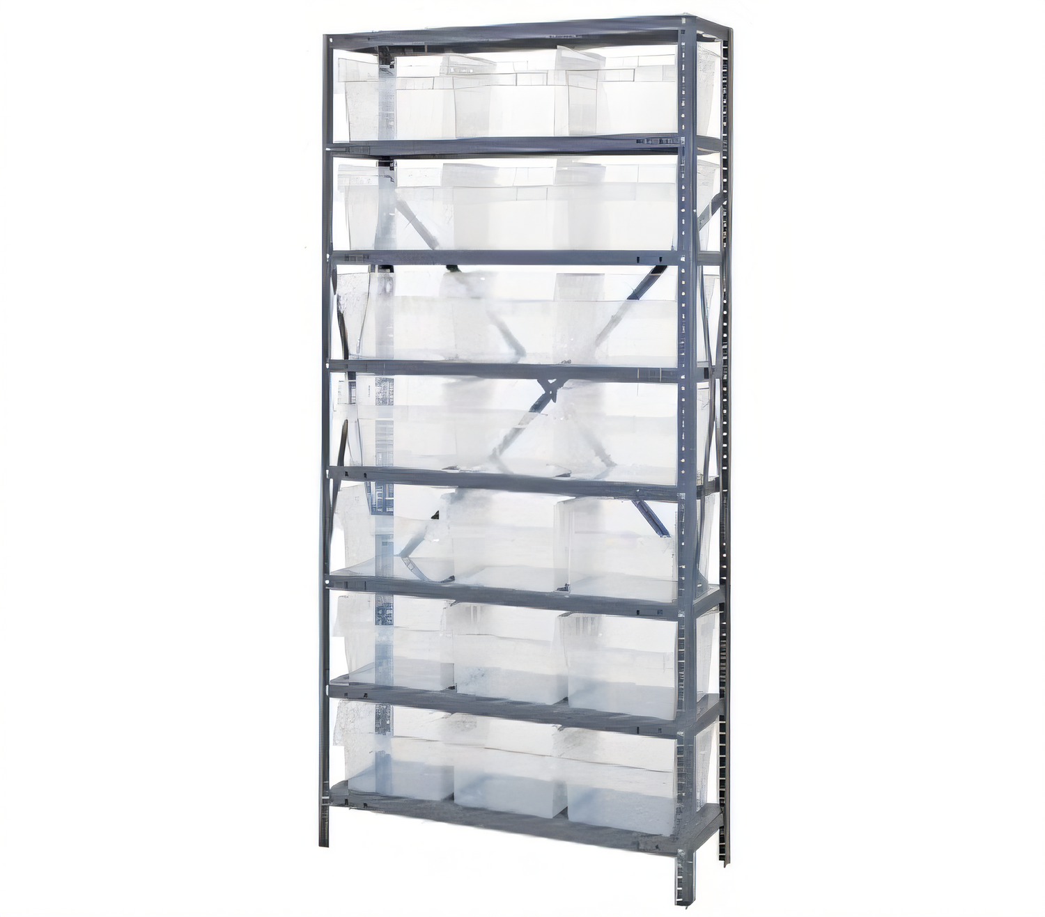 Shelving Unit, 12"D x 36"L x 75"H, heavy duty, 400 lb. load capacity per shelf, includes: (8) shelves, (21) 11-5/8"L x 8-3/8"W x 8"H (QSB809) clear bins, uprights and cross bars, smooth powder-coat finish