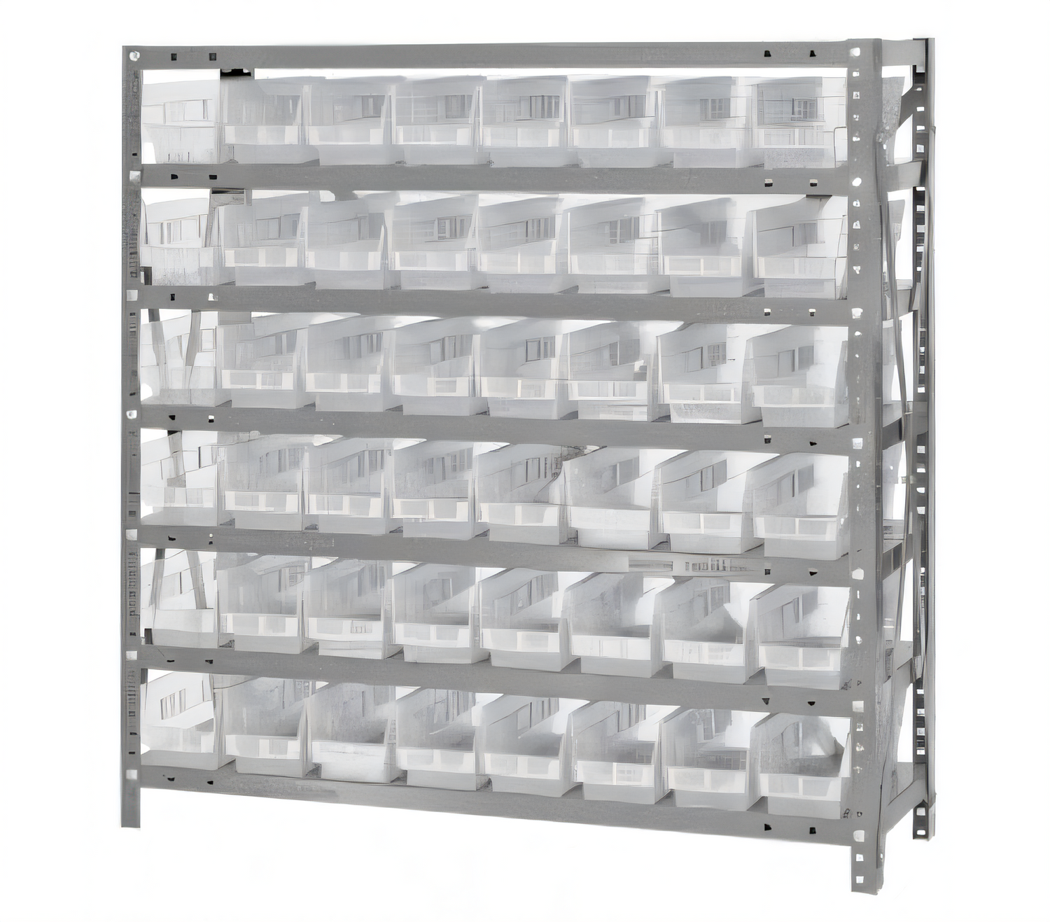 Shelving Unit, 18"D x 36"L x 39"H, heavy duty, 400 lb. load capacity per shelf, includes: (7) shelves, (48) 17-7/8"L x 4-1/8"W x 4"H (QSB103) clear bins, uprights and cross bars, smooth powder-coat finish
