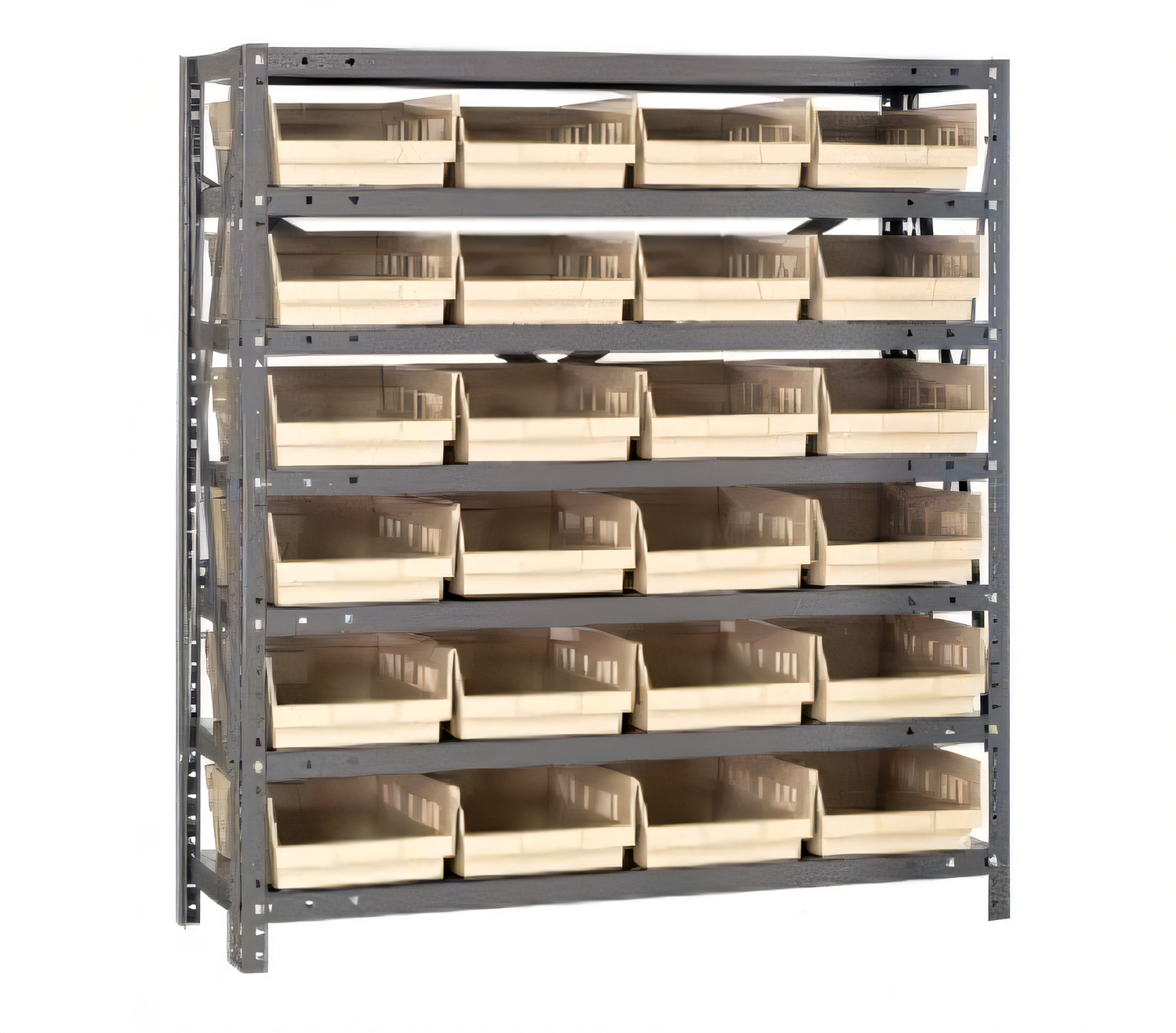 Shelving Unit, 18"D x 36"L x 39"H, heavy duty, 400 lb. load capacity per shelf, includes: (7) shelves, (24) 17-7/8"L x 8-3/8"W x 4"H (QSB108) bins available in multiple colors, uprights and cross bars, smooth powder-coat finish