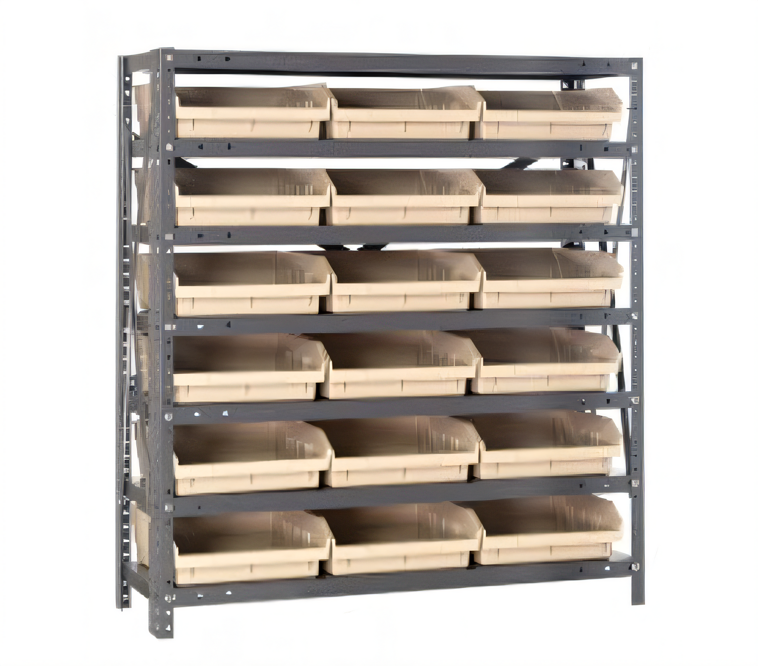 Shelving Unit, 18"D x 36"L x 39"H, heavy duty, 400 lb. load capacity per shelf, includes: (7) shelves, (18) 17-7/8"L x 11-1/8"W x 4"H (QSB110) bins available in multiple colors, uprights and cross bars, smooth powder-coat finish