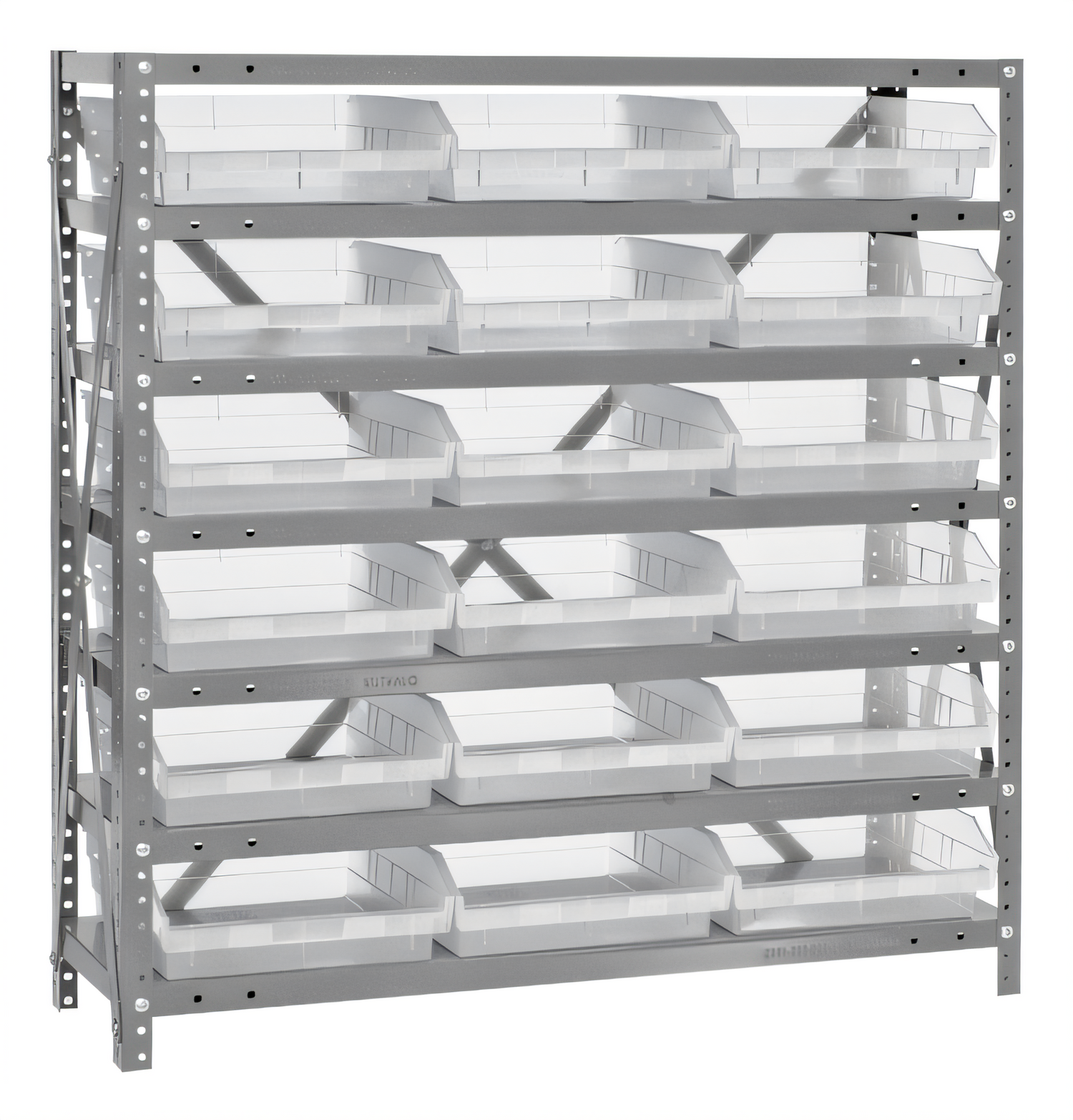 Shelving Unit, 18"D x 36"L x 39"H, heavy duty, 400 lb. load capacity per shelf, includes: (7) shelves, (18) 17-7/8"L x 11-1/8"W x 4"H (QSB110) clear bins, uprights and cross bars, smooth powder-coat finish
