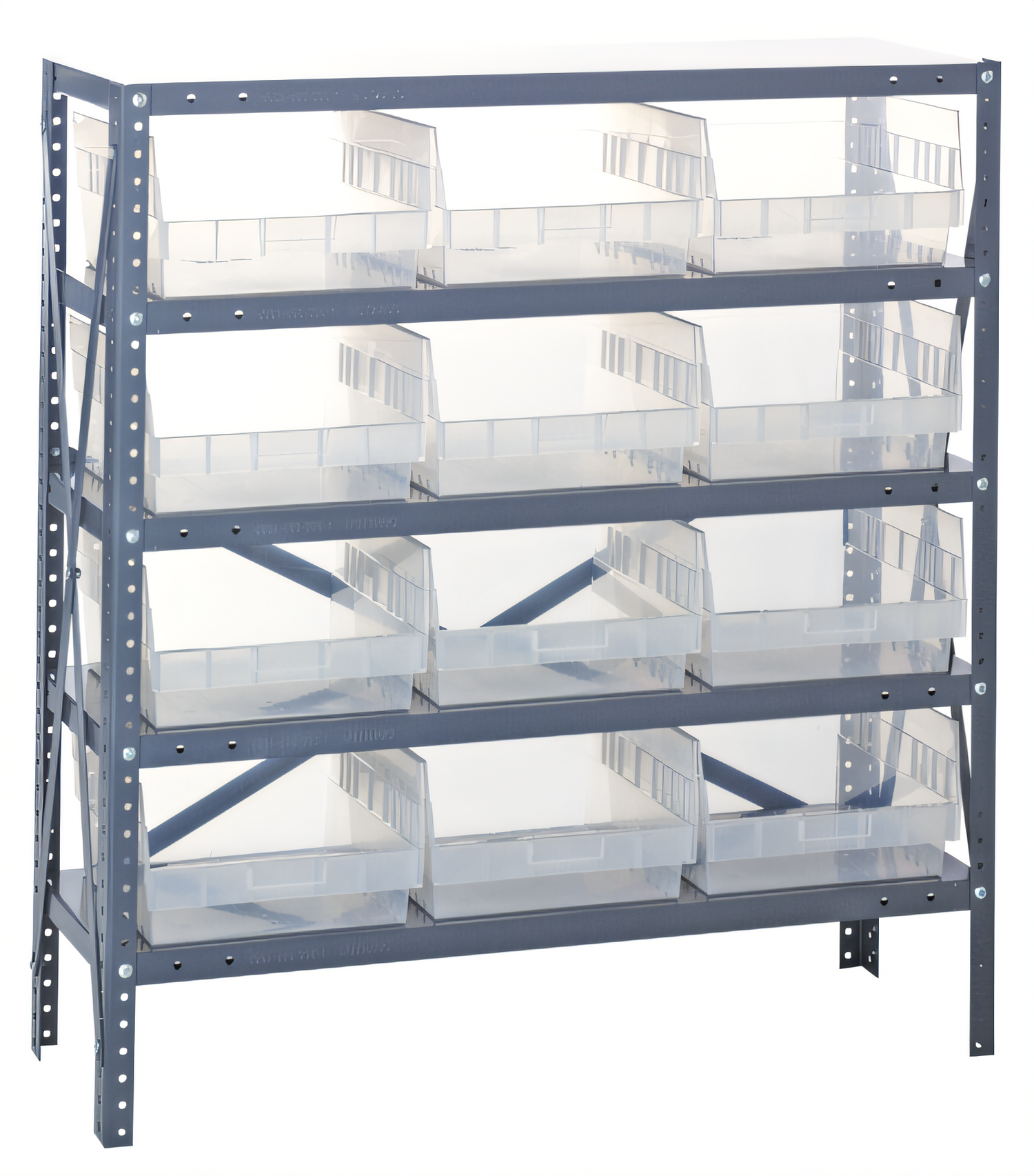 Shelving Unit, 18"D x 36"L x 39"H, heavy duty, 400 lb. load capacity per shelf, includes: (5) shelves, (12) 17-7/8"L x 11-1/8"W x 6"H (QSB210) clear bins, uprights and cross bars, smooth powder-coat finish