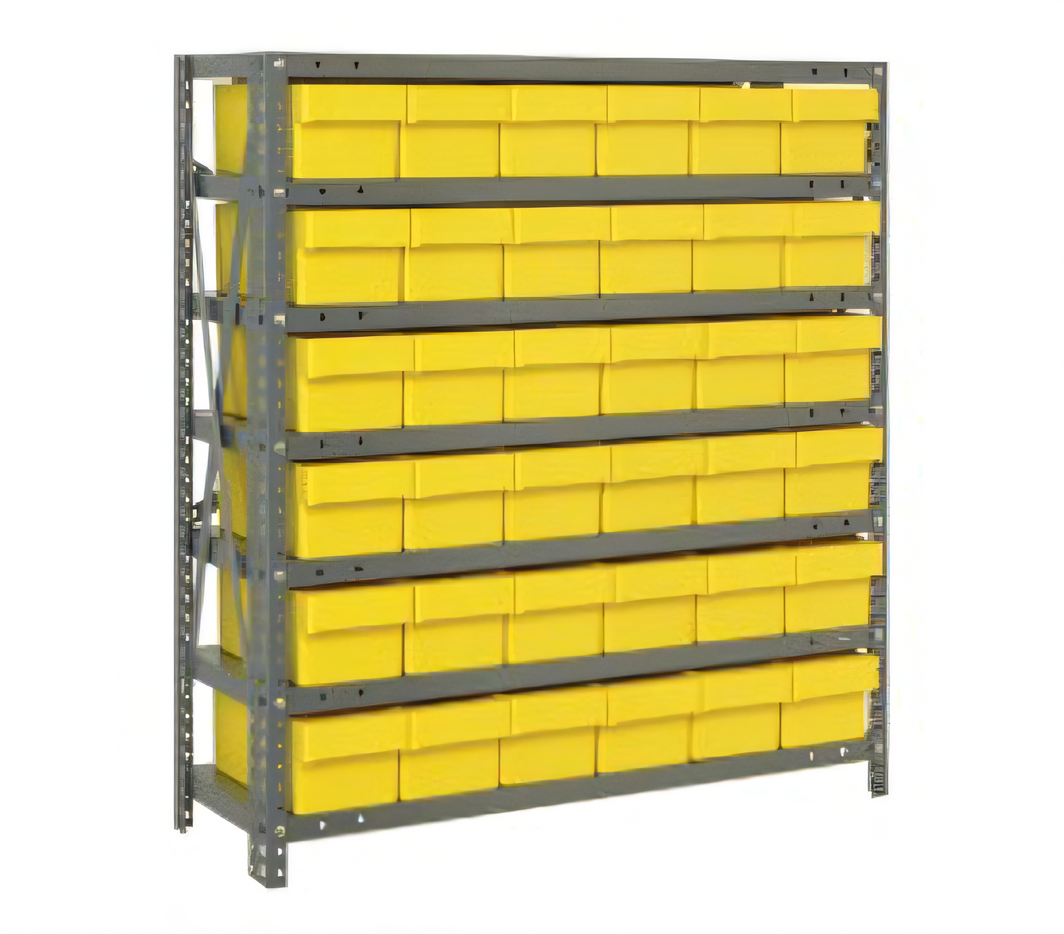 Shelving Unit, 18"D x 36"L x 39"H, heavy duty, 400 lb. load capacity per shelf, includes: (7) shelves, (36) 17-7/8"L x 5-9/16"W x 4-5/8"H (QED602) bins available in multiple colors, uprights and cross bars, smooth powder-coat finish