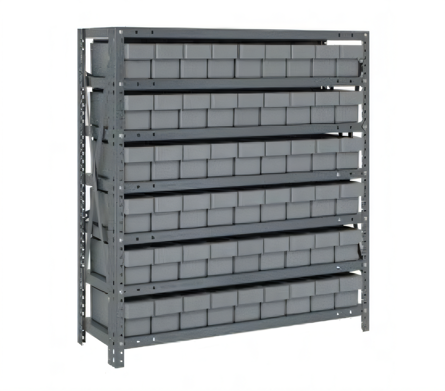 Shelving Unit, 18"D x 36"L x 39"H, heavy duty, 400 lb. load capacity per shelf, includes: (7) shelves, (54) 17-7/8"L x 3-3/4"W x 4-5/8"H (QED604) bins available in multiple colors, uprights and cross bars, smooth powder-coat finish
