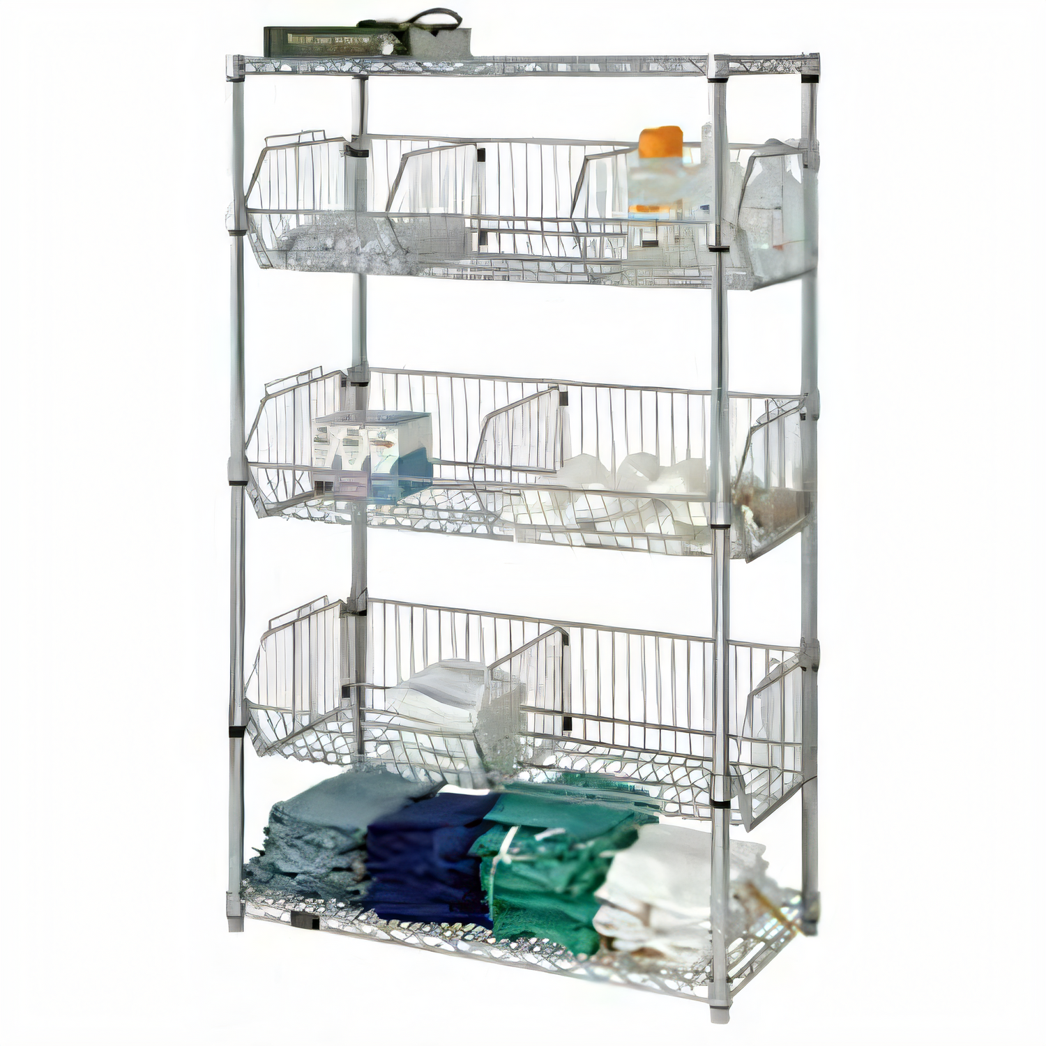 Wire Basket Unit, stationary, 48"W x 18"L x 63"H, 110 lb. capacity per basket, includes: (2) wire shelves, (4) posts & (3) adjustable in 1" increments baskets with collar hooks, chrome plated finish, NSF, shipped KD