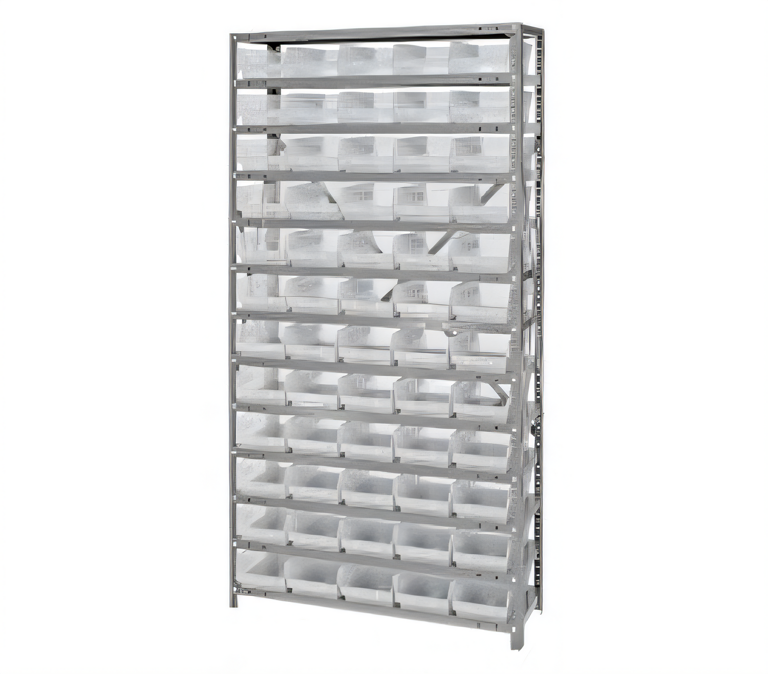 Shelving Unit, 18"D x 36"L x 75"H, heavy duty, 400 lb. load capacity per shelf, includes: (13) shelves, (60) 17-7/8"L x 6-5/8"W x 4"H (QSB104) clear bins, uprights and cross bars, smooth powder-coat finish