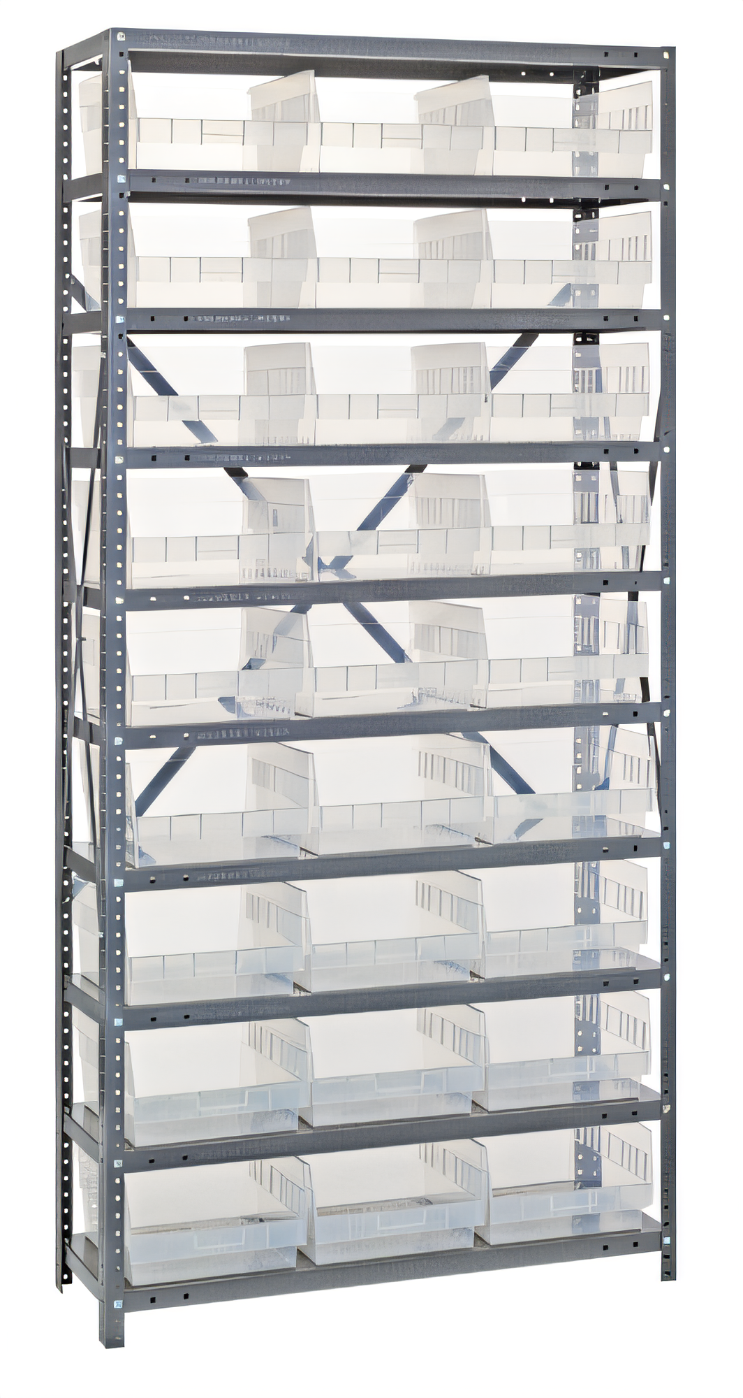 Shelving Unit, 18"D x 36"L x 75"H, heavy duty, 400 lb. load capacity per shelf, includes: (13) shelves, (27) 17-7/8"L x 11-1/8"W x 4"H (QSB210) clear bins, uprights and cross bars, smooth powder-coat finish