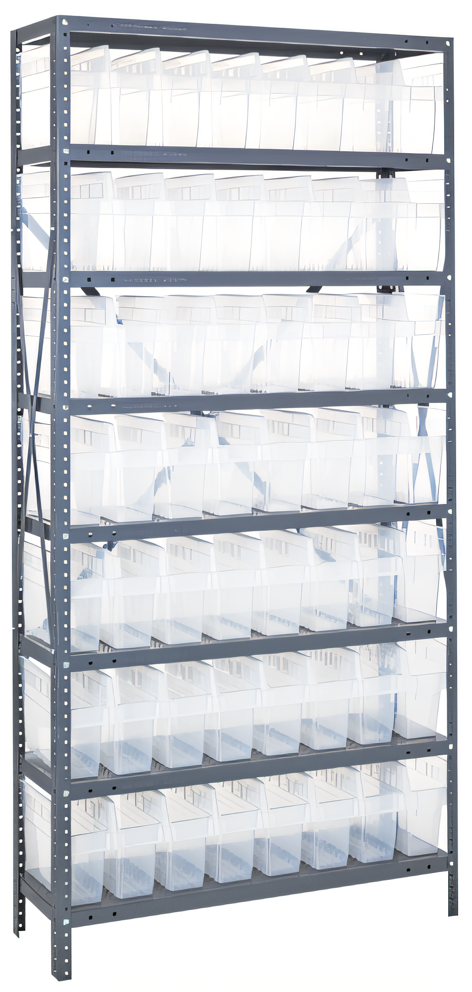 Shelving Unit, 18"D x 36"L x 75"H, heavy duty, 400 lb. load capacity per shelf, includes: (8) shelves, (56) 17-7/8"L x 4-3/8"W x 8"H (SSB803) clear bins, uprights and cross bars, smooth powder-coat finish