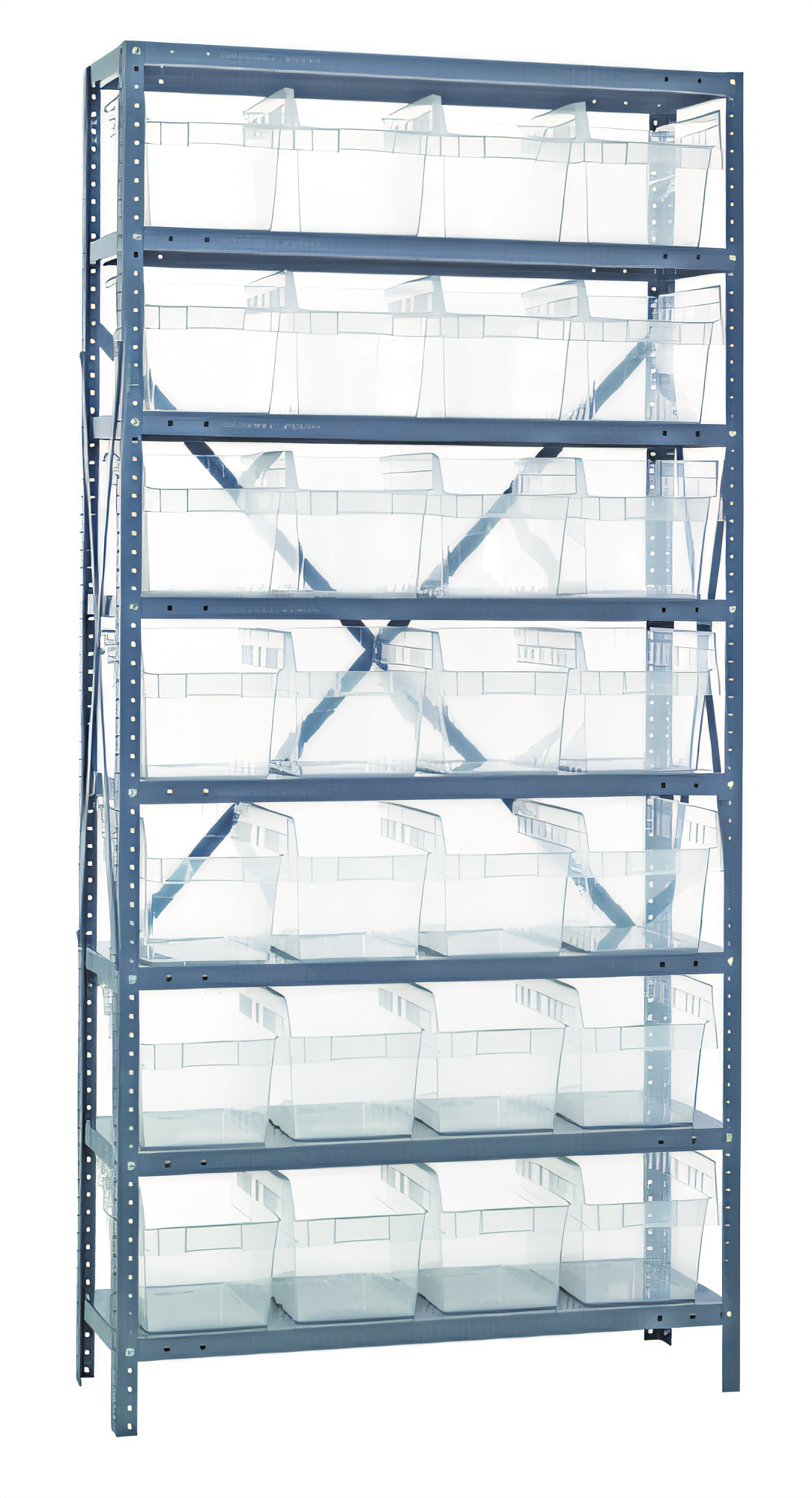 Shelving Unit, 18"D x 36"L x 75"H, heavy duty, 400 lb. load capacity per shelf, includes: (8) shelves, (28) 17-7/8"L x 8-3/8"W x 8"H (SSB808) clear bins, uprights and cross bars, smooth powder-coat finish