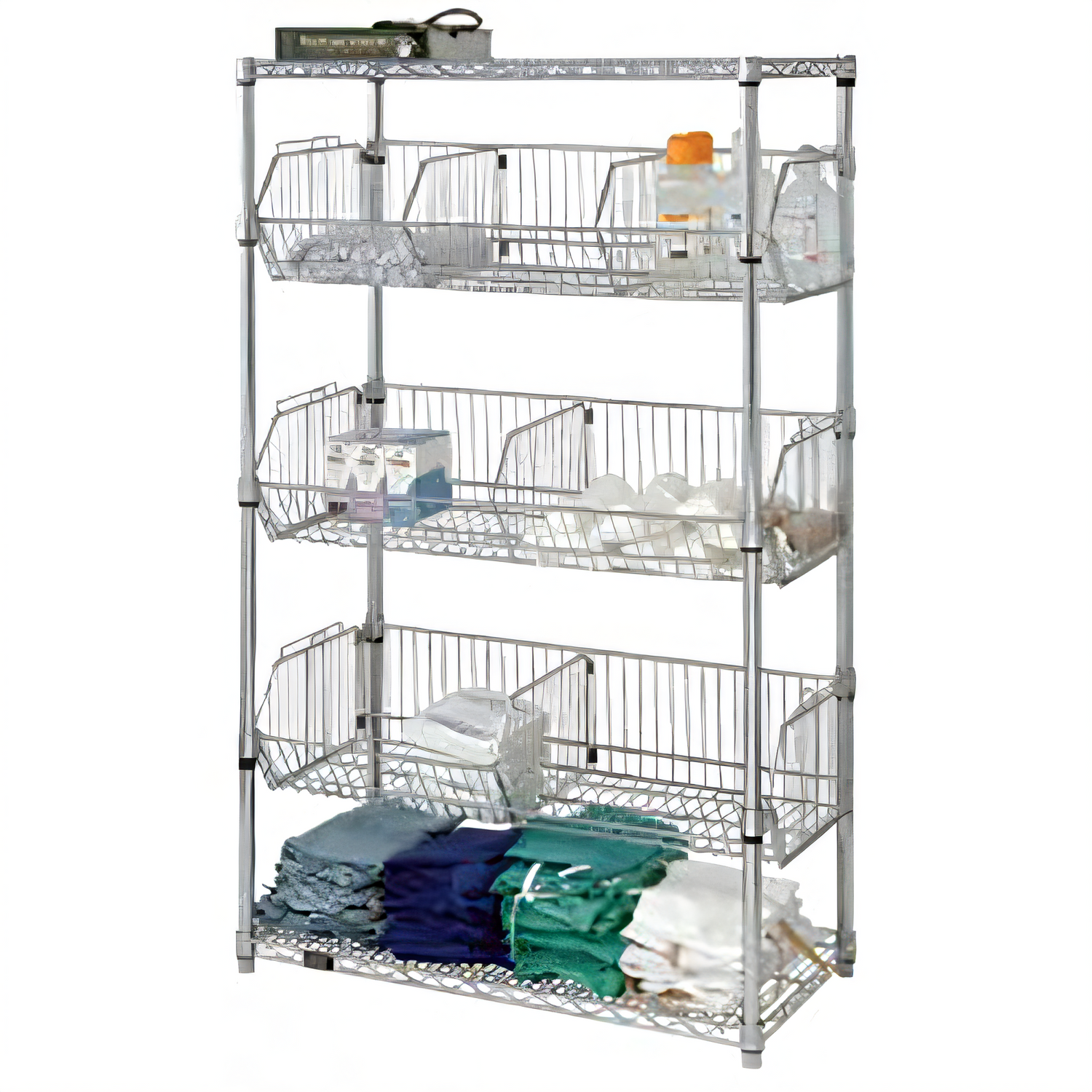 Wire Basket Unit, stationary, 36"W x 24"L x 63"H, 110 lb. capacity per basket, includes: (2) wire shelves, (4) posts & (3) adjustable in 1" increments baskets with collar hooks, chrome plated finish, NSF, shipped KD