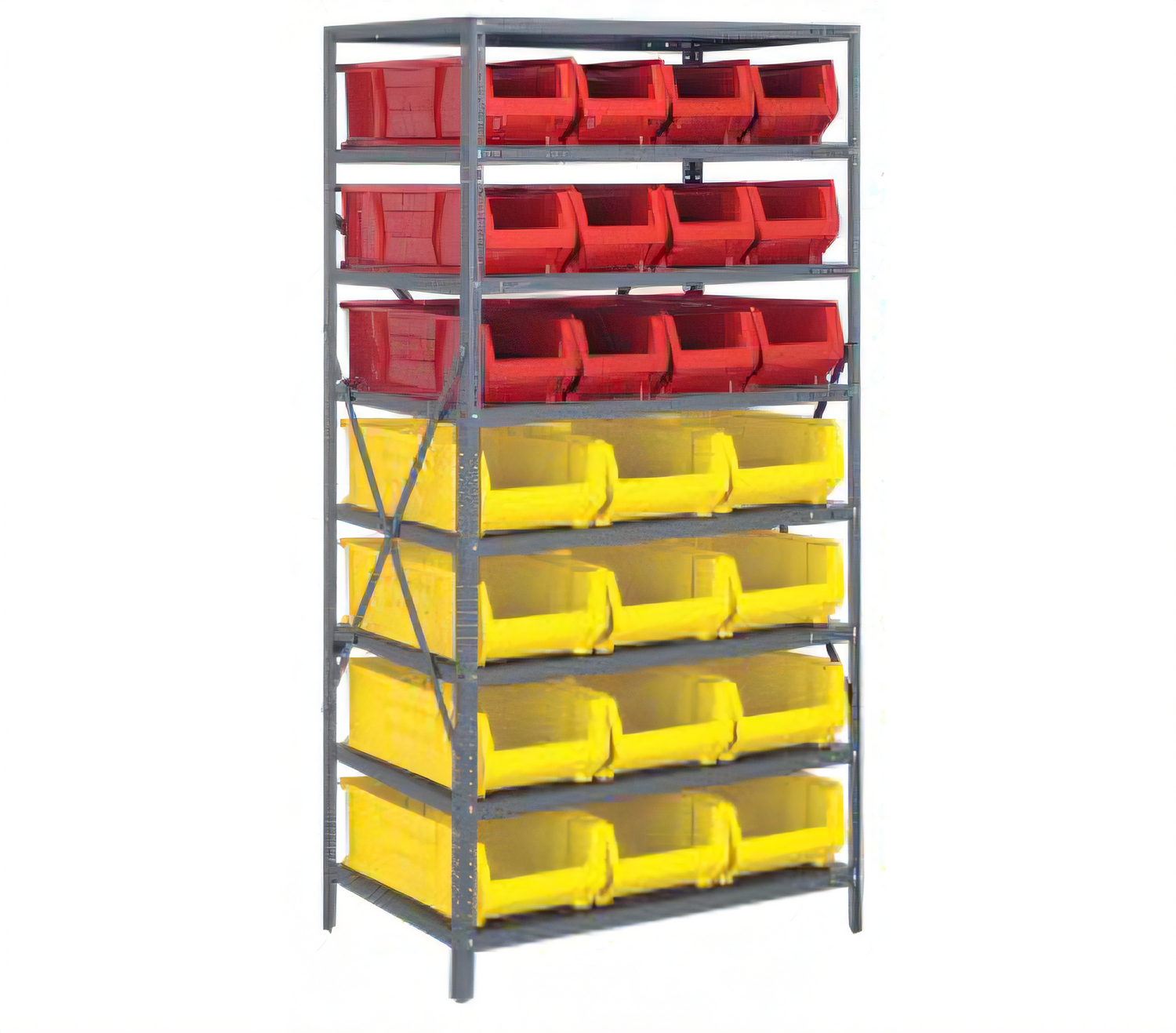 Includes 24 Color-Coded Storage Bins & 8 Reinforced ShelvesBuilt for warehouses, workshops and storerooms that refuse to compromise on strength or organization, this Quantum shelving system supports 400 lb. per shelf while keeping small- to mid-size parts sorted in high-capacity, industrial-grade bins.