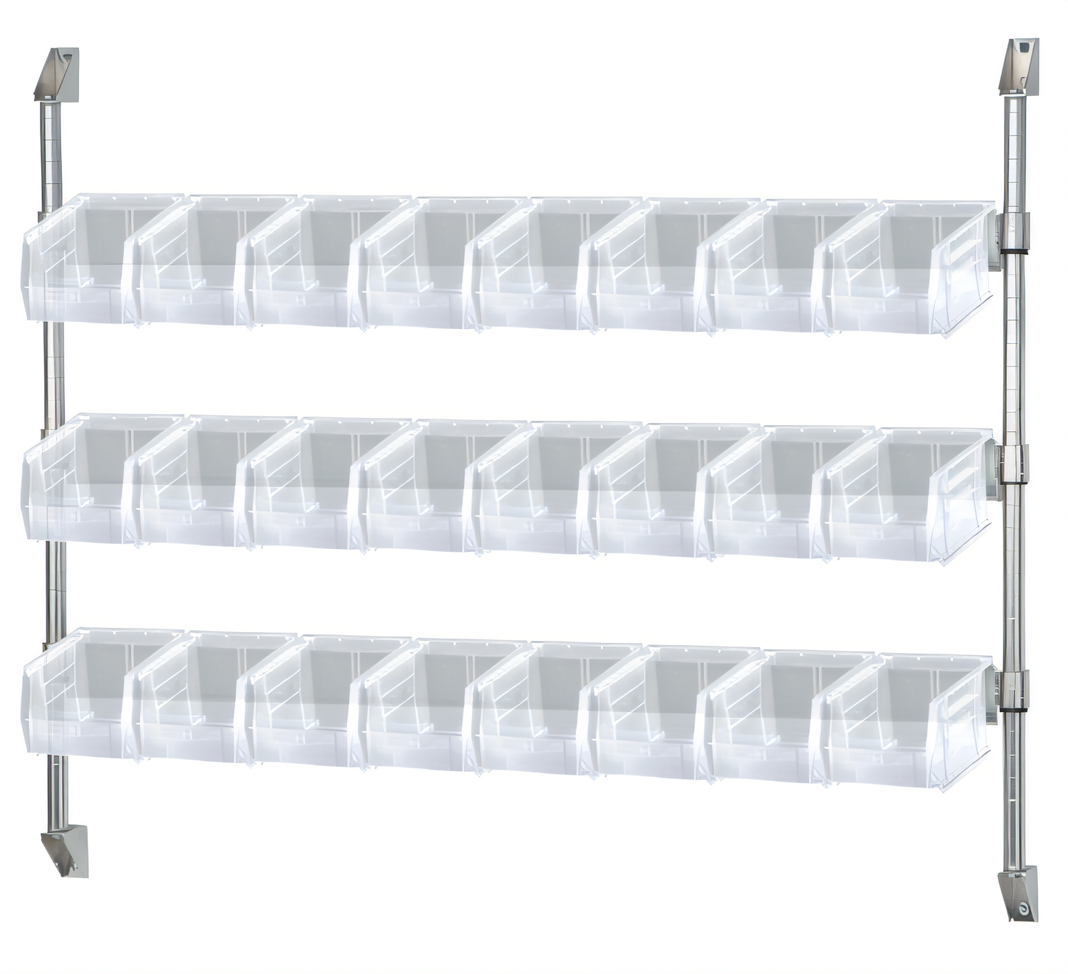 Cantilever Bin Holder Post Wall Mount, 48"W x 10-7/8"D x 34"H, includes: (3) bin rails, (18) clear bins (QUS230 available in multiple colors), (2) 34" posts, & (4) post wall brackets, chrome plated finish, NSF