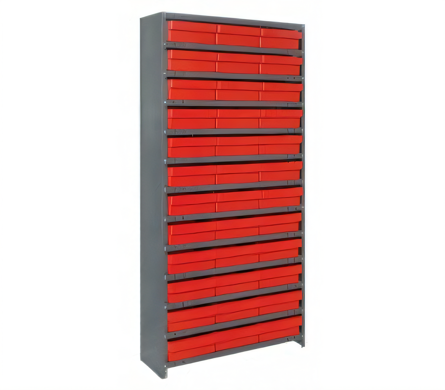 12" D × 36" L × 75" H • includes 36 QED801 storage binsEngineered for demanding industrial, commercial, and back-of-house environments, this Quantum closed shelving system delivers exceptional weight capacity and superior parts organization. Each of the 13 shelves supports up to 400 lb, while the 36 color-coded QED801 bins keep small to mid-size items sorted, visible, and instantly accessible.