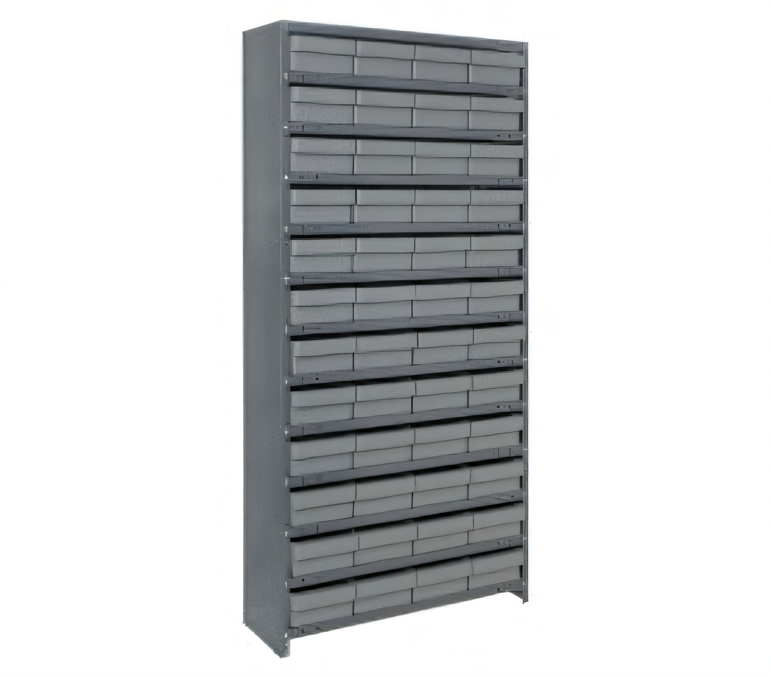 Model: QED606-C | 18" D × 36" W × 75" HTackle high-density parts storage and fast visual picking with this industrial-grade closed shelving system from Quantum. Thirteen adjustable shelves support up to 400 lb each, while forty-eight QED606 bins (available in multiple colors) keep parts, hardware and supplies neatly organized and protected from dust.