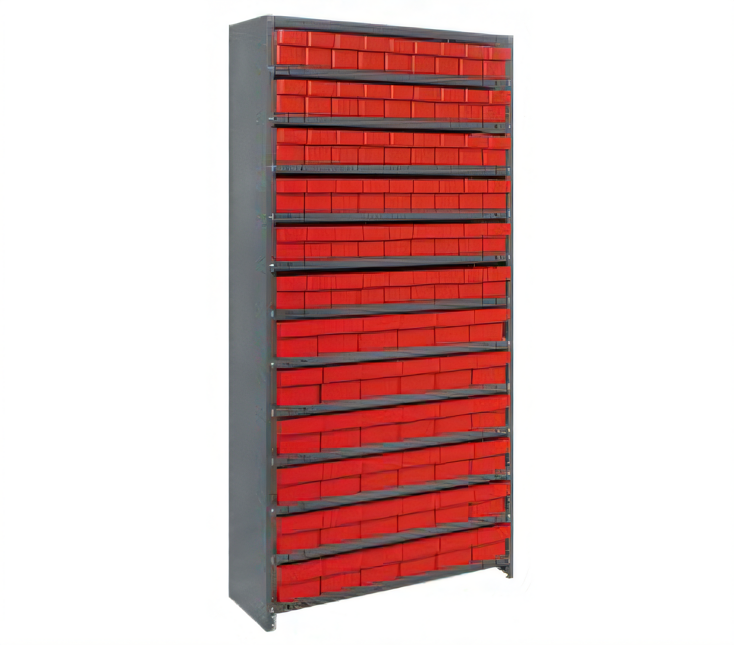 with 13 Shelves & 90 QED Series Dividable-Grid BinsBuilt for demanding stock rooms, assembly areas and MRO departments, this all-steel Quantum shelving system combines 400 lb per-shelf strength with the flexibility of color-coded, dividable-grid storage bins. Ships complete with uprights, cross bars, shelves and hardware—just unbox, assemble and get organized.