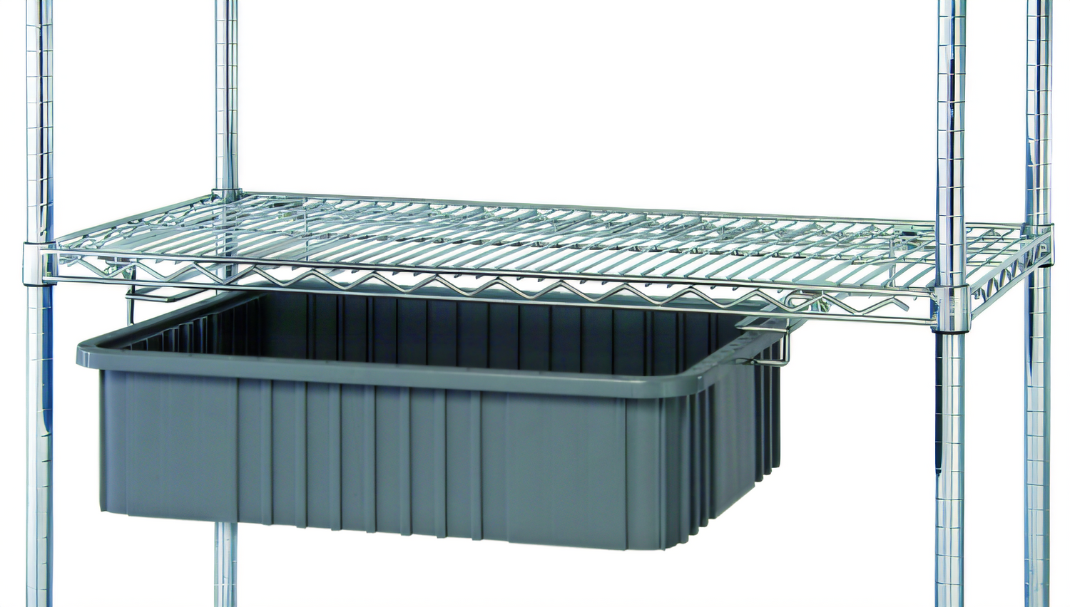 Single Bin Drawer Slide, suspends bins & trays (not included) below wire shelves, chrome plated finish