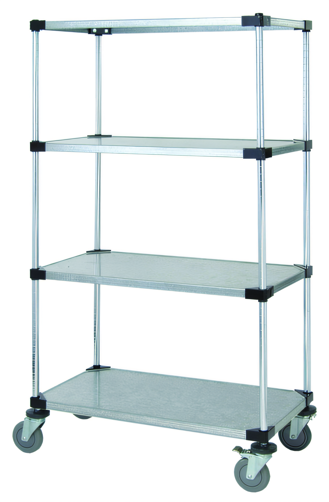 Mobile Cart, 60"W x 18"D x 80"H, includes: (4) solid galvanized steel shelves, (4) 74"H chrome posts, (4) donut bumpers, & (4) 5" thermoplastic resin casters (2 with brakes)