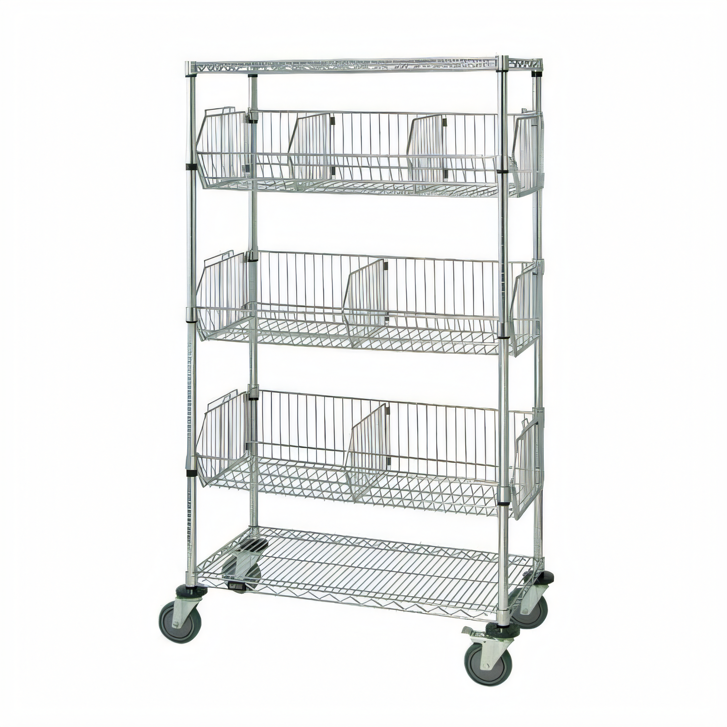 Basket Unit, mobile, 36"W x 24"D x 69"H, includes: (4) posts, (3) adjustable baskets with collar hooks, (2) wire shelves, (4) donut bumpers & (4) 5" swivel polyurethane casters (2 with brakes), chrome plate finish, NSF, shipped KD