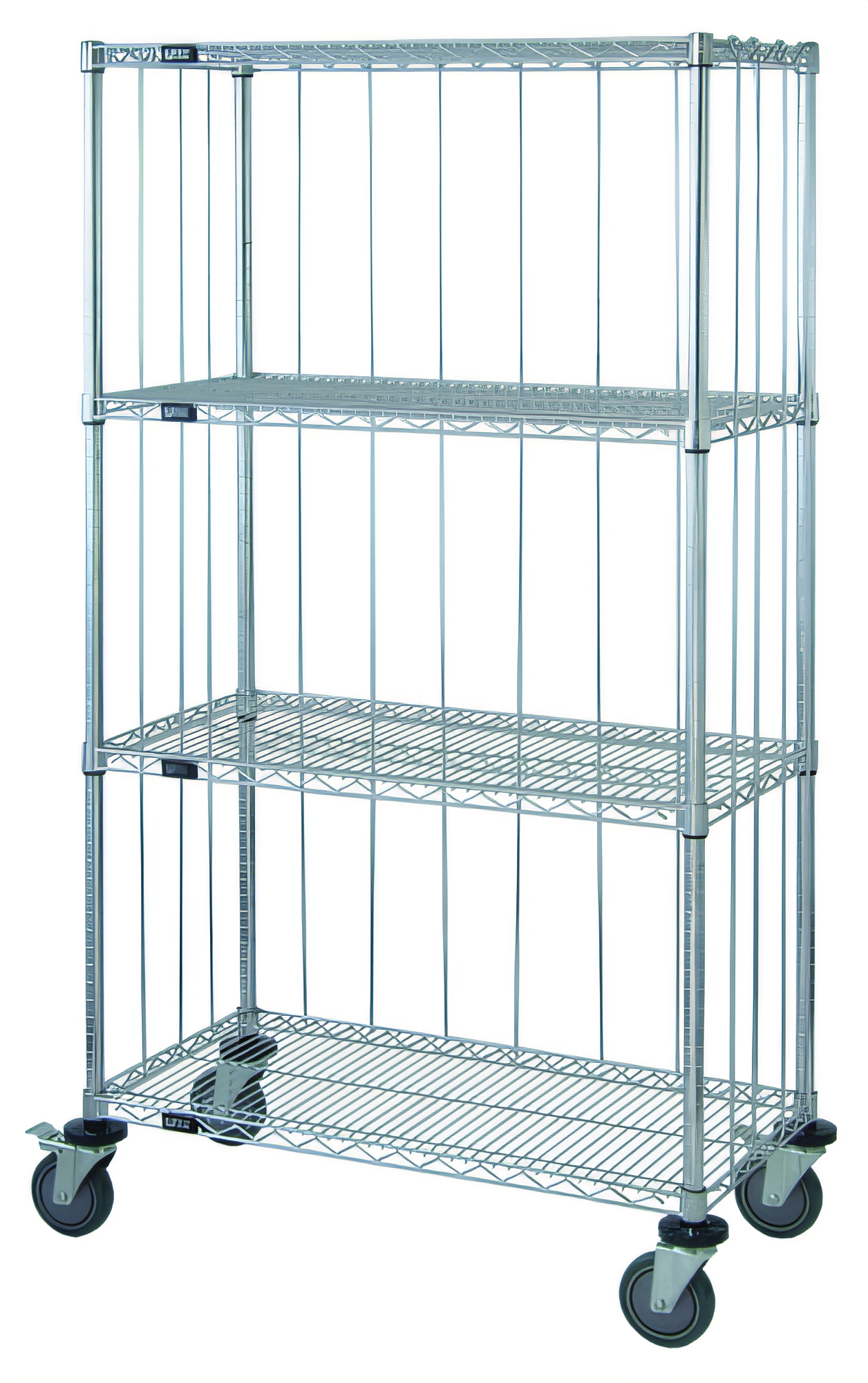 Mobile Enclosure Cart, 36"W x 24"D x 80"H, includes: (4) wire shelves, (4) 74"H posts, rods and tabs kits, (4) donut bumpers, & (4) 5" thermoplastic resin casters (2 with brakes), chrome plated finish