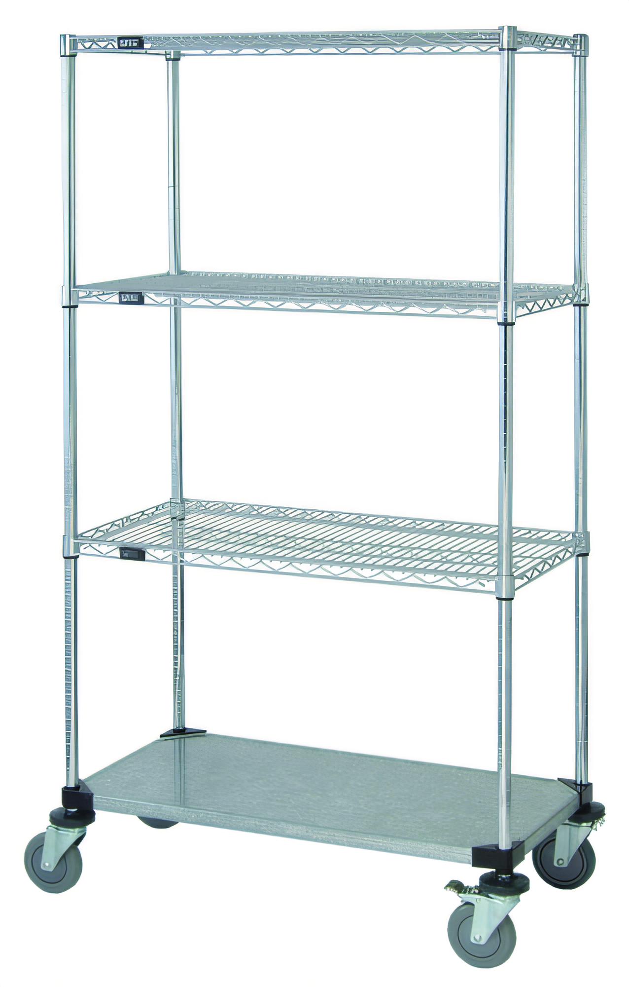 Mobile Cart, 48"W x 24"D x 69"H, includes: (3) wire shelves, (1) solid galvanized steel shelf, (4) 63"H posts, (4) donut bumpers, & (4) 5" thermoplastic resin casters (2 with brakes), chrome plated finish