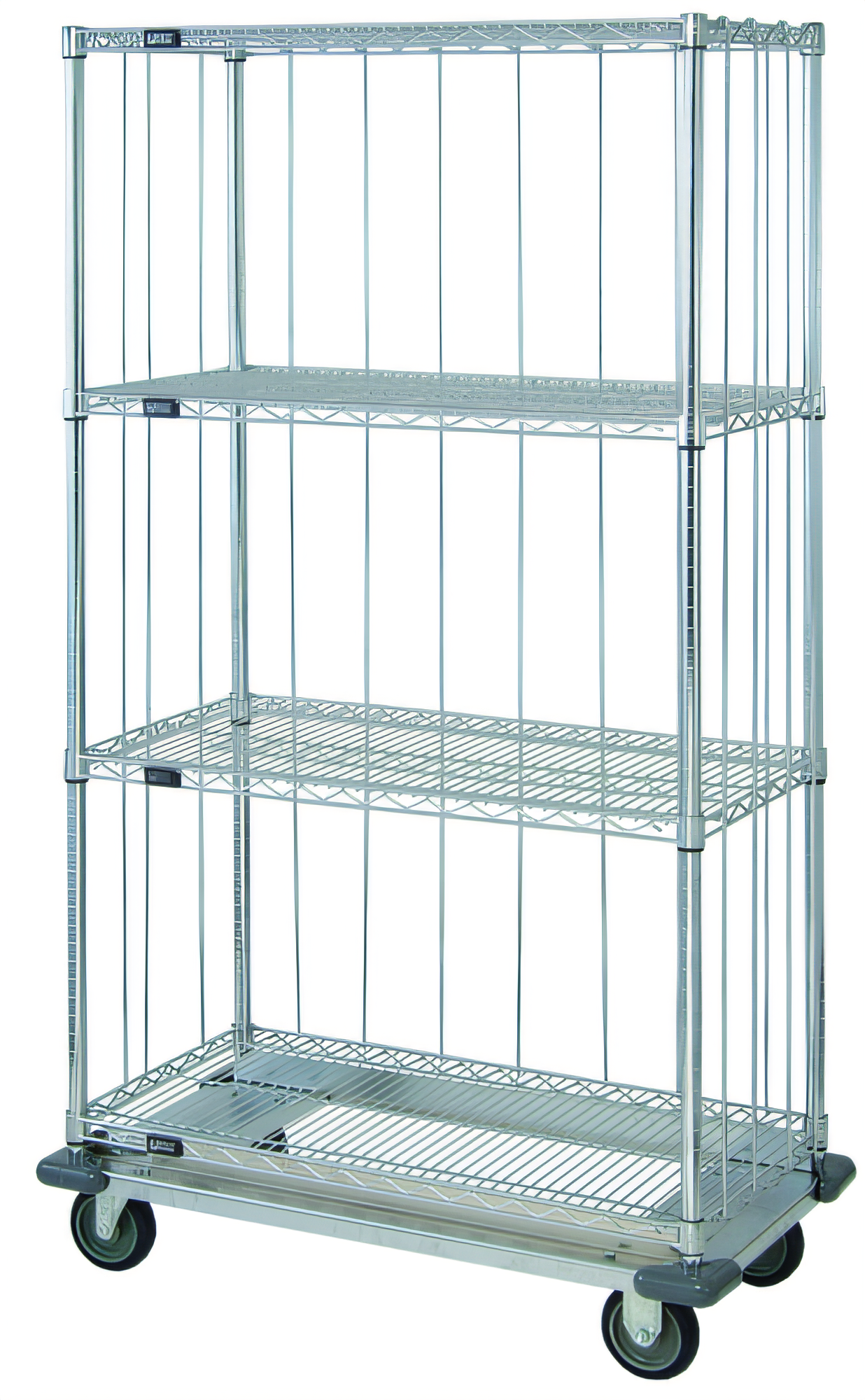 Mobile Enclosure Cart, 36"W x 18"D x 81"H, includes: (4) wire shelves, (4) 74"H posts, rods and tabs kits, (1) dolly base, & (4) plate thermoplastic resin casters (2 rigid, 2 swivel with brakes), chrome plated finish