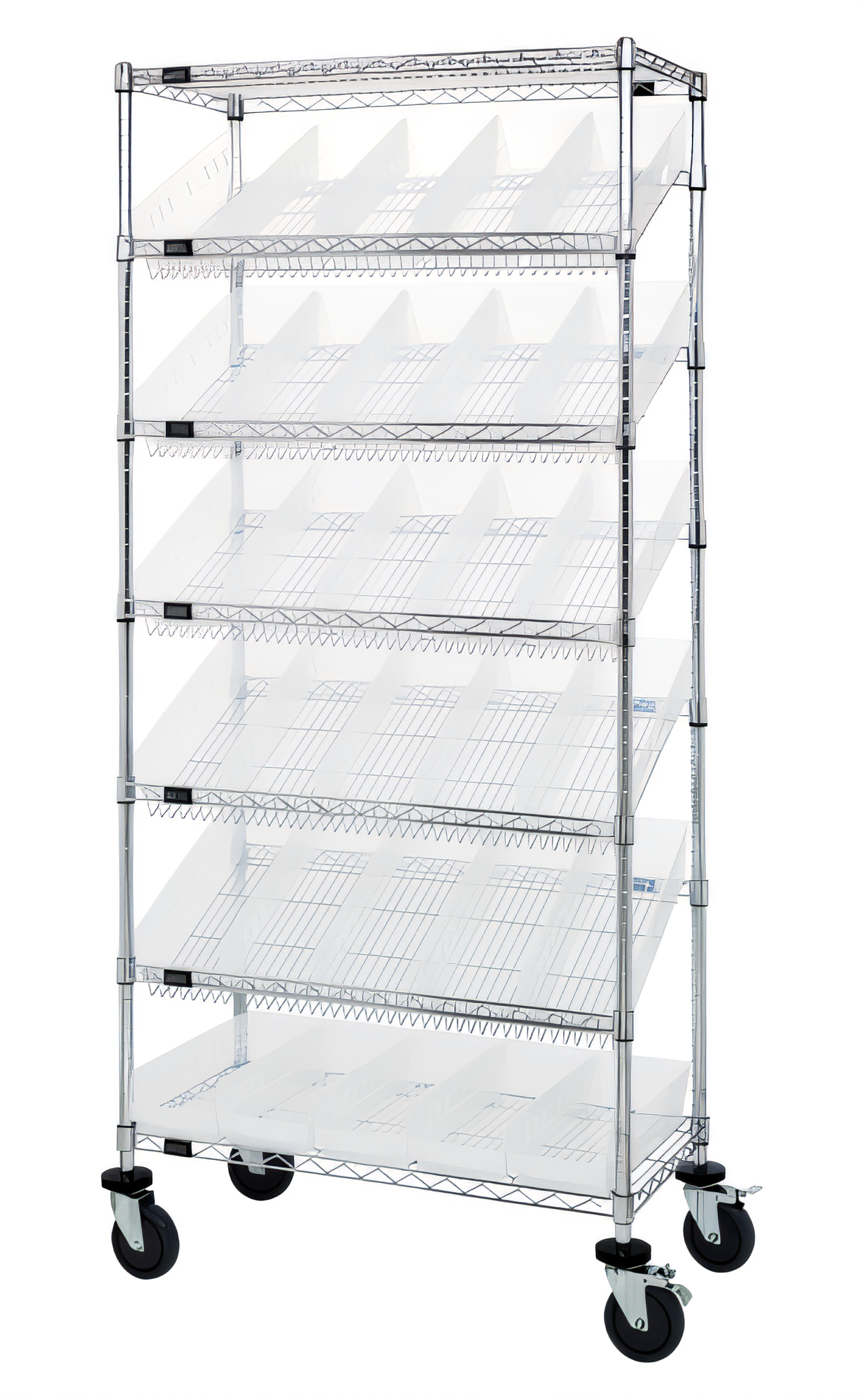 Bin Systems Unit, mobile, 36"W x 18"D x 80"H, includes: (2) flat wire shelves, (5) slanted wire shelves, (4) posts, (30) 17-7/8"W x 6-5/8"D x 4"H clear bins (QSB104CL) & (4) 5" swivel polyurethane casters (2 with brakes), chrome plated finish, NSF, shipped KD
