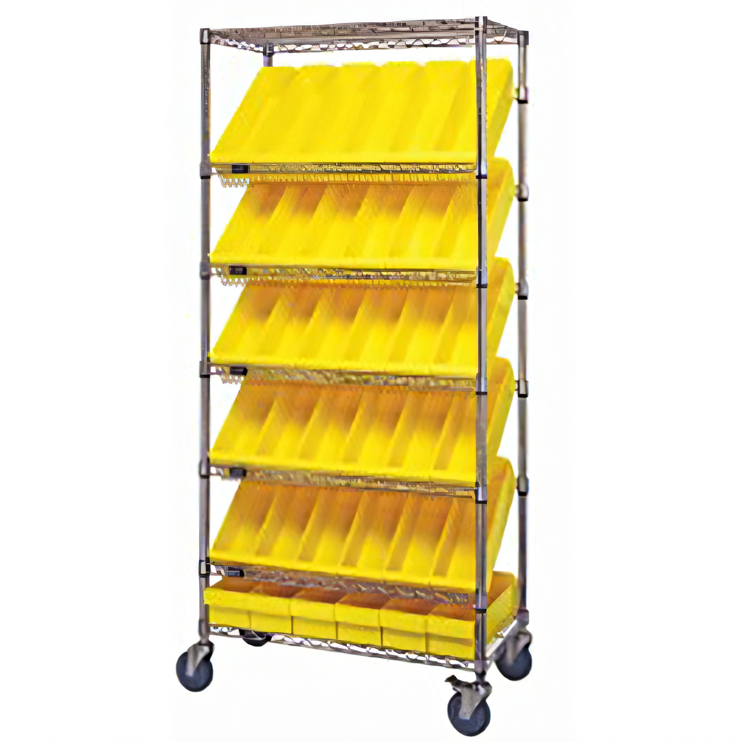 Bin Systems Unit, mobile, 36"L x 18"W x 80"H, includes: (4) posts, (2) flat wire shelves, (5) slanted wire shelves, (30) 17-5/8"L x 5-9/16"W x 4-5/8"H bins (QED602) (bins available in multiple colors) and (4) 5" swivel polyurethane casters (2 with brakes), chrome plated finish, suitable for dry storage applications, shipped KD