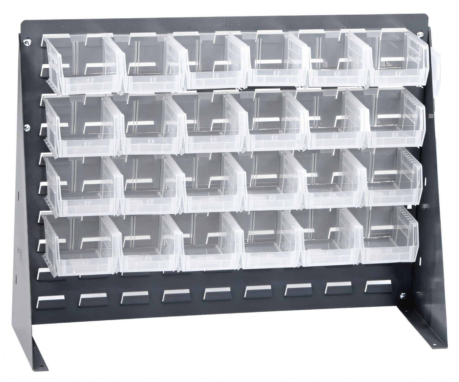 Bench Rack, 27-3/4"L x 8"W x 21"H, 16 gauge steel louvered model, includes: (24) 5-3/8"L x 4-1/8"W x 3"H clear bins, gray enamel finish