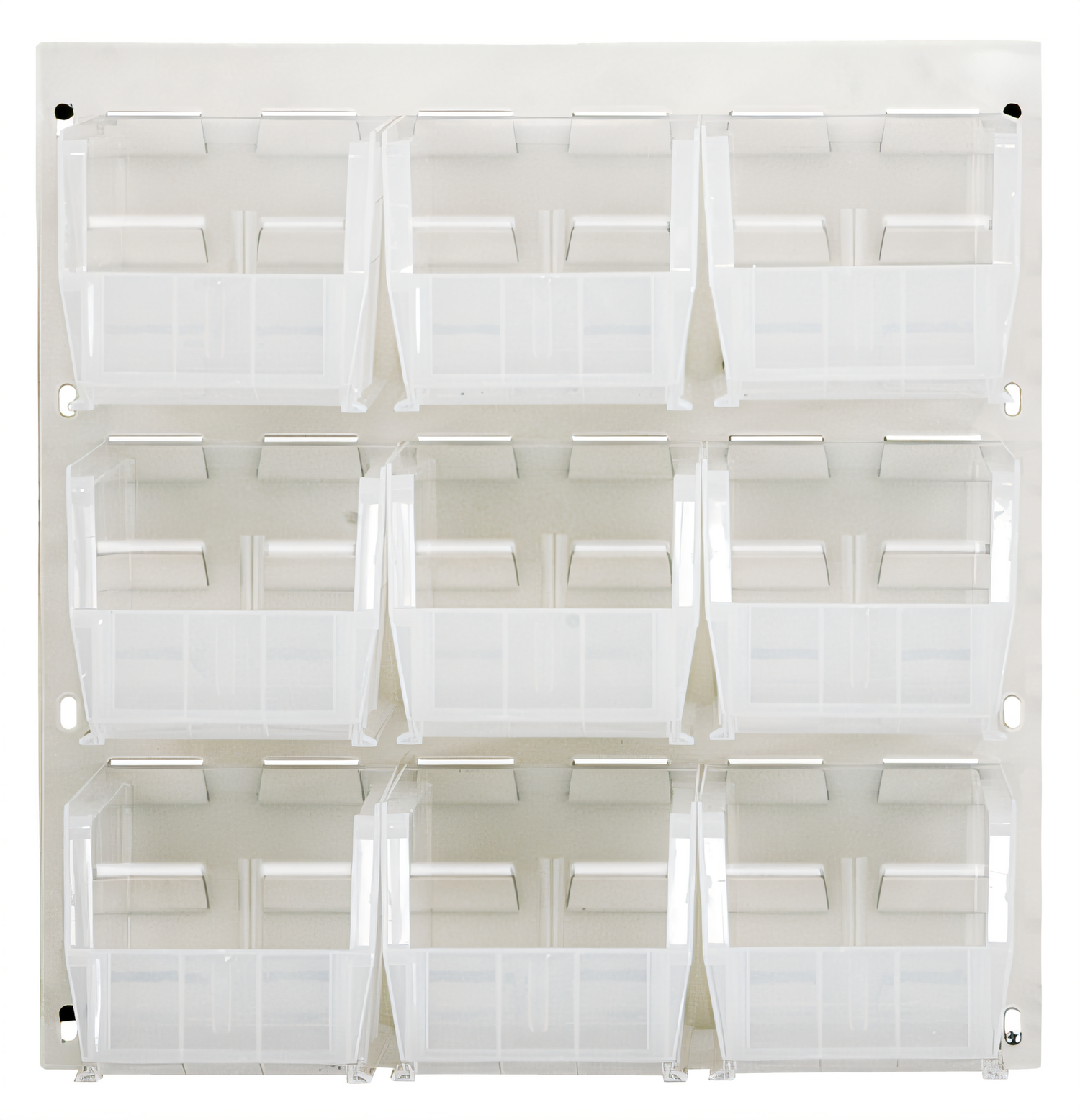 Louvered Panel, wall mounted, 18"L x 11"D x 19"H, includes: (9) QUS230, clear bins, heavy-duty 16 gauge cold rolled steel, oyster white enamel coated finish (mounting hardware not included)
