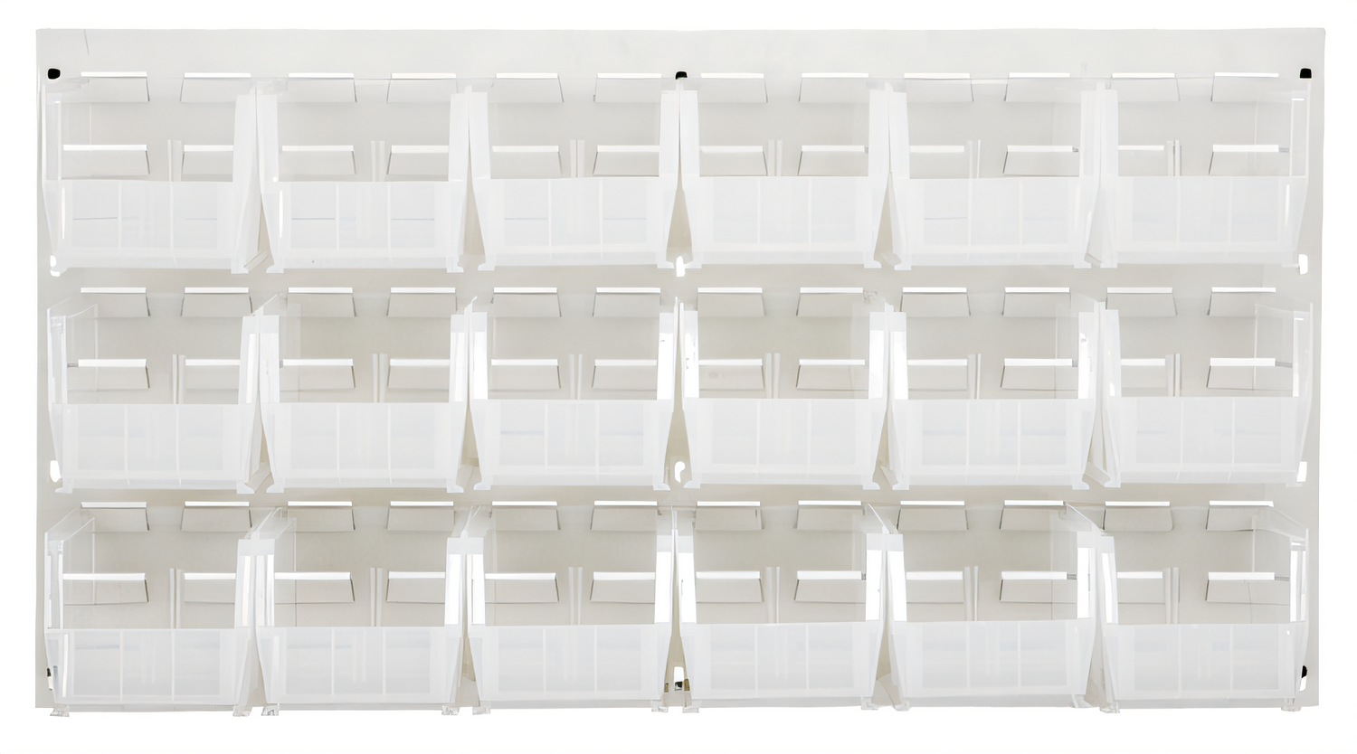 Louvered Panel, wall mounted, 36"L x 11"D x 19"H, includes: (18) QUS230, clear bins, heavy-duty 16 gauge cold rolled steel, oyster white enamel coated finish (mounting hardware not included)