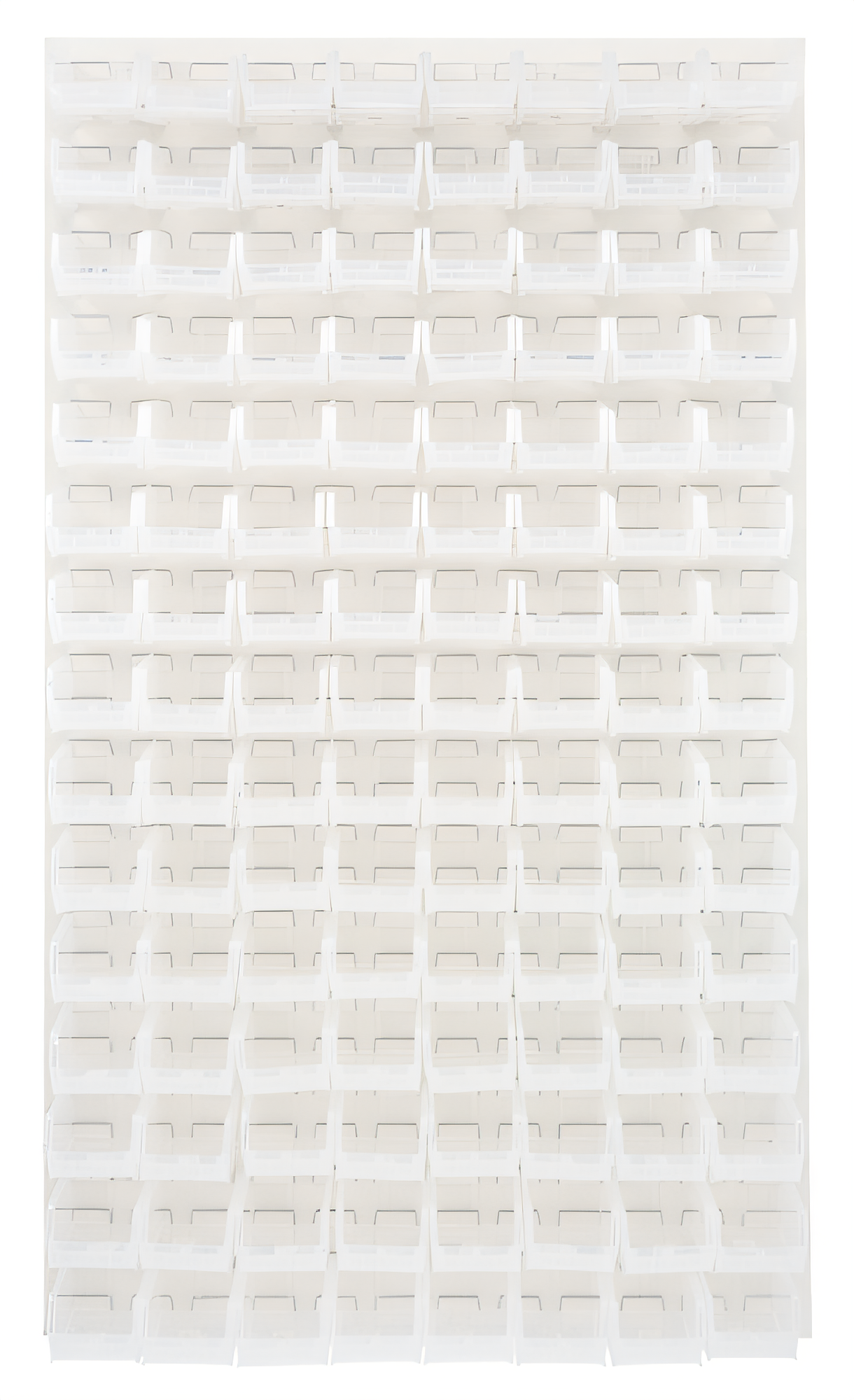 Louvered Panel, wall mounted, 36"L x 8"D x 61"H, includes: (120) QUS220, clear bins, heavy-duty 16 gauge cold rolled steel, oyster white enamel coated finish (mounting hardware not included)