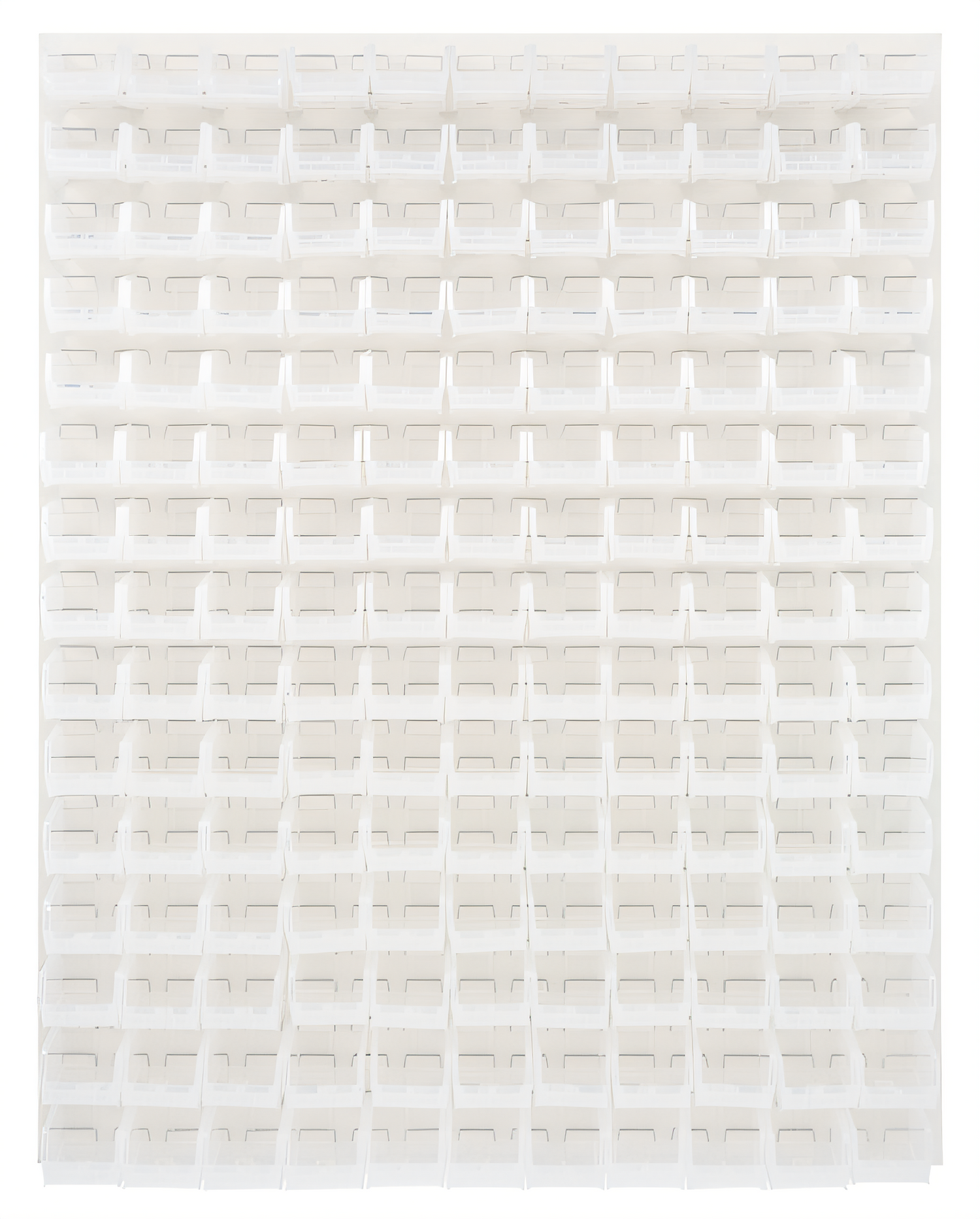 Louvered Panel, wall mounted, 48"L x 8"D x 61"H, includes: (165) QUS220, clear bins, heavy-duty 16 gauge cold rolled steel, oyster white enamel coated finish (mounting hardware not included)