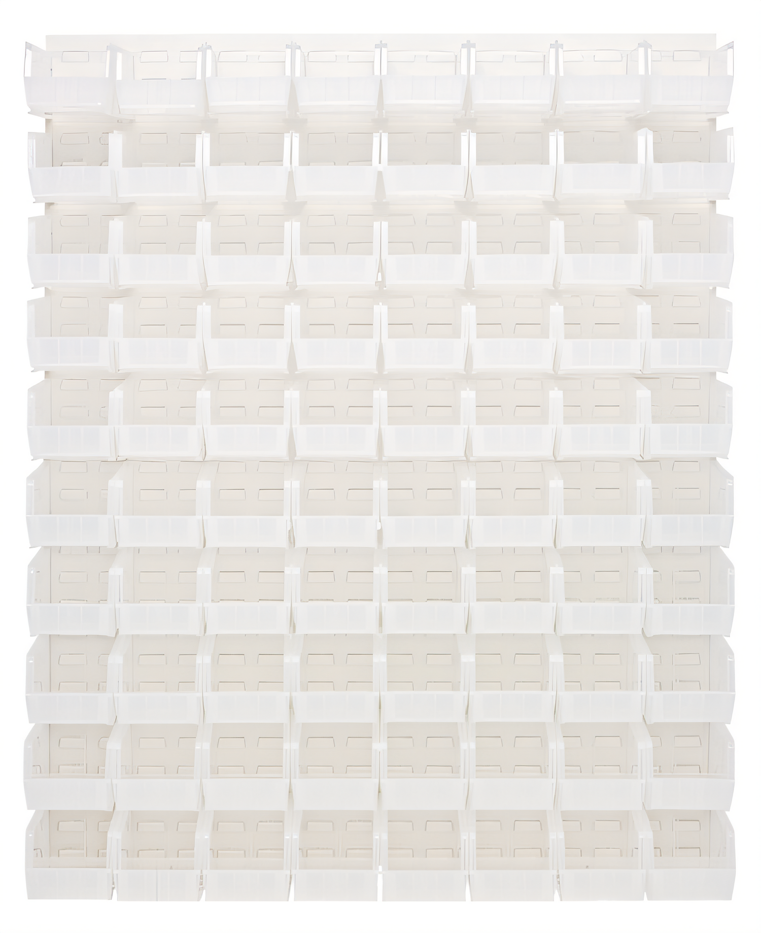 Louvered Panel, wall mounted, 48"L x 11"D x 61"H, includes: (80) QUS230, clear bins, heavy-duty 16 gauge cold rolled steel, oyster white enamel coated finish (mounting hardware not included)