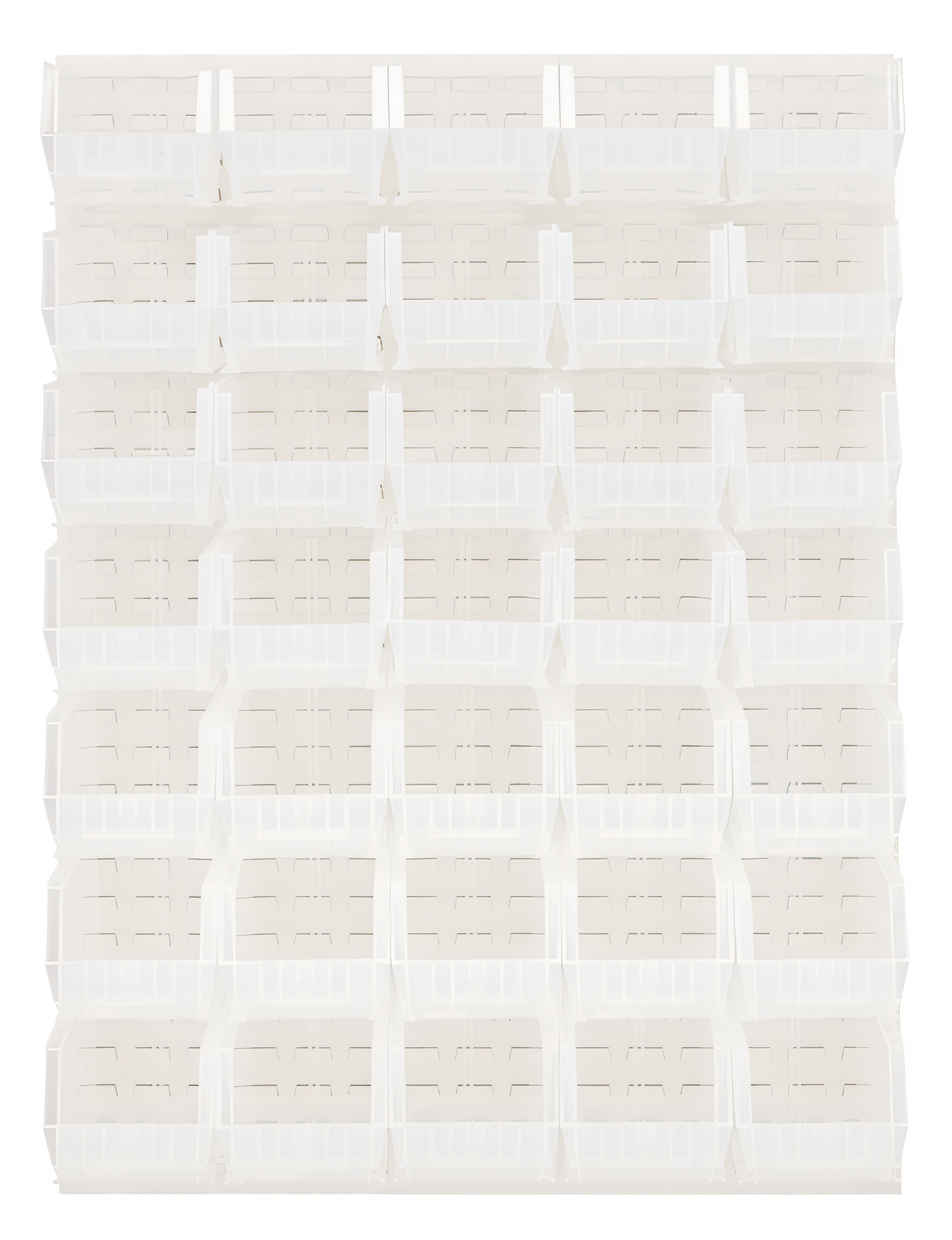 Louvered Panel, wall mounted, 48"L x 15"D x 61"H, includes: (35) QUS240, clear bins, heavy-duty 16 gauge cold rolled steel, oyster white enamel coated finish (mounting hardware not included)