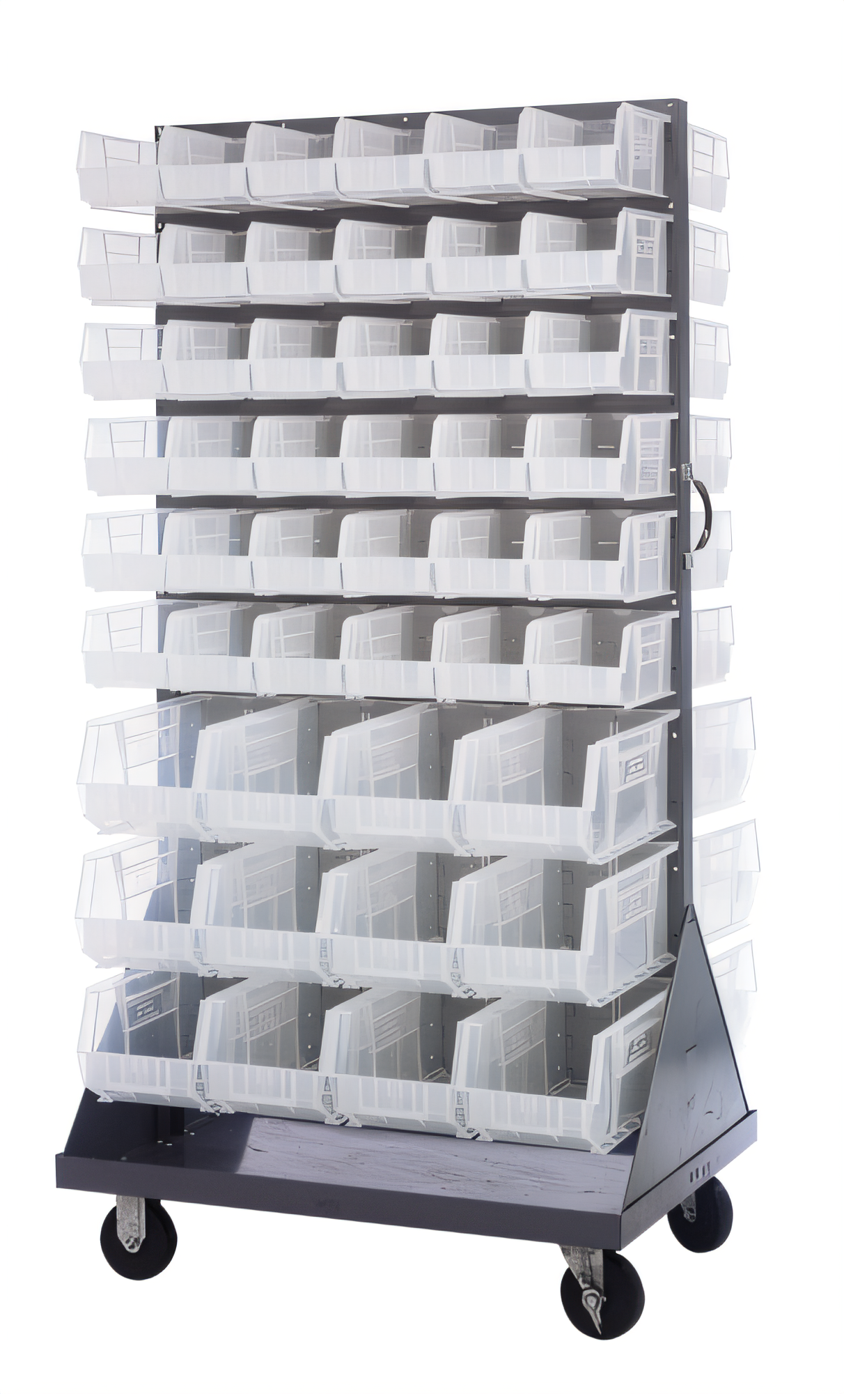 - Double-sided louvered panels accept bins on both faces for maximum storage density.