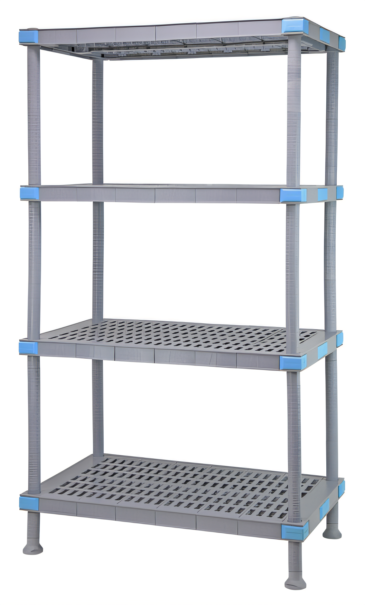 Millenia Shelving Unit, 30"W x 21"D x 50"H, up to 2000 lbs load capacity, includes: (4) open grid shelves with removable shelf mats and (4) posts, all polymer, rust proof, gray finish, NSF, Made in USA